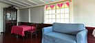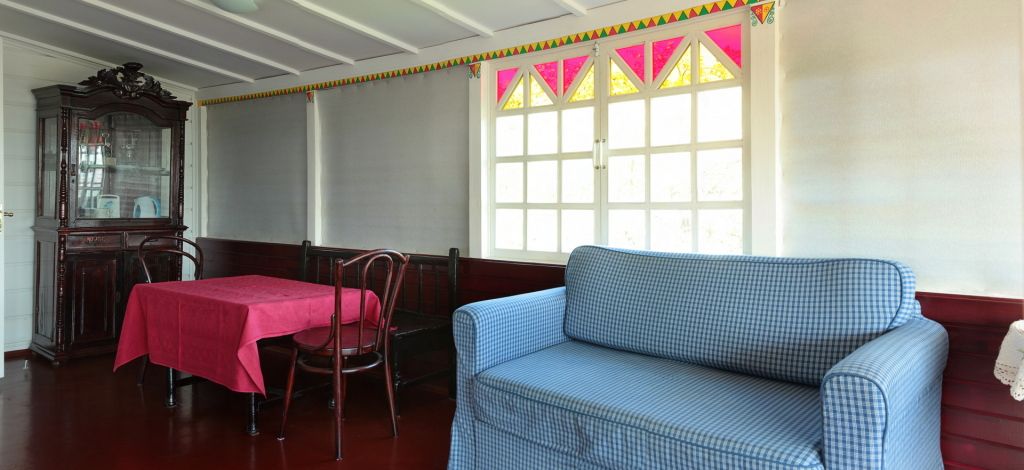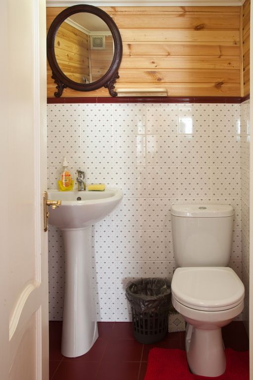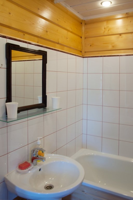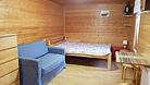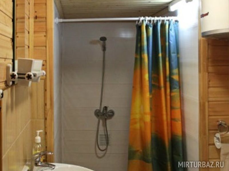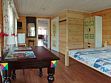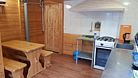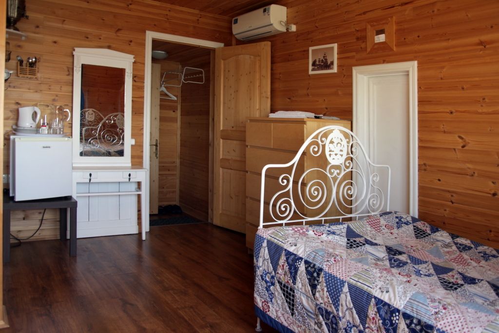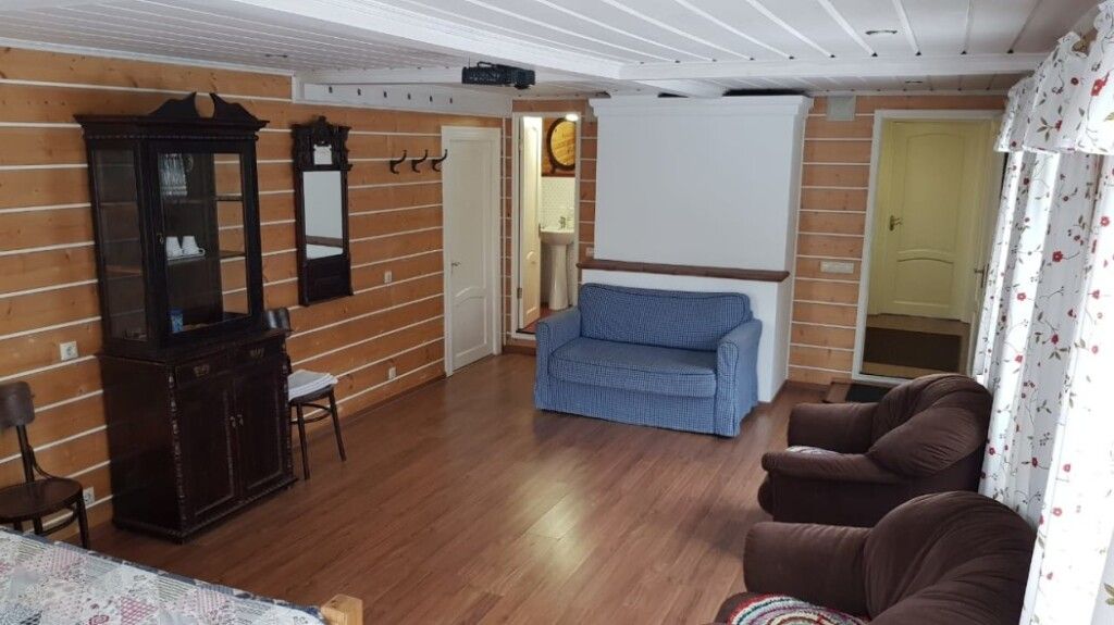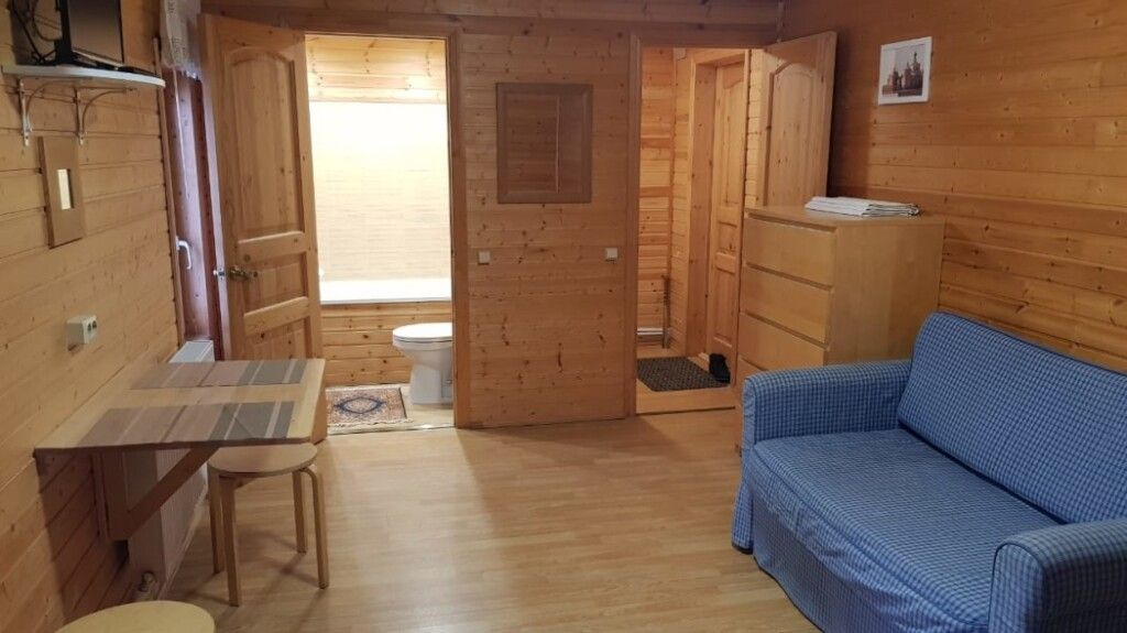 В номере: спальные места, санузел с ванной, кондиционер, платяной шкаф, зеркало, жалюзи, старинная горка под посуду, 2 стола, стулья, лавки, TV, чайник с чайными принадлежностями, холодильник, посуда, столовые приборы. Покрытие в гостиной - ковролин.