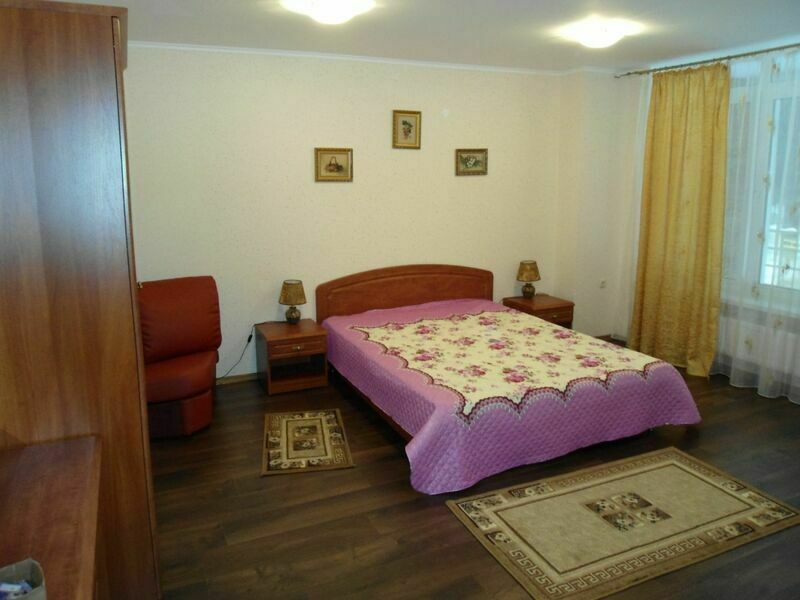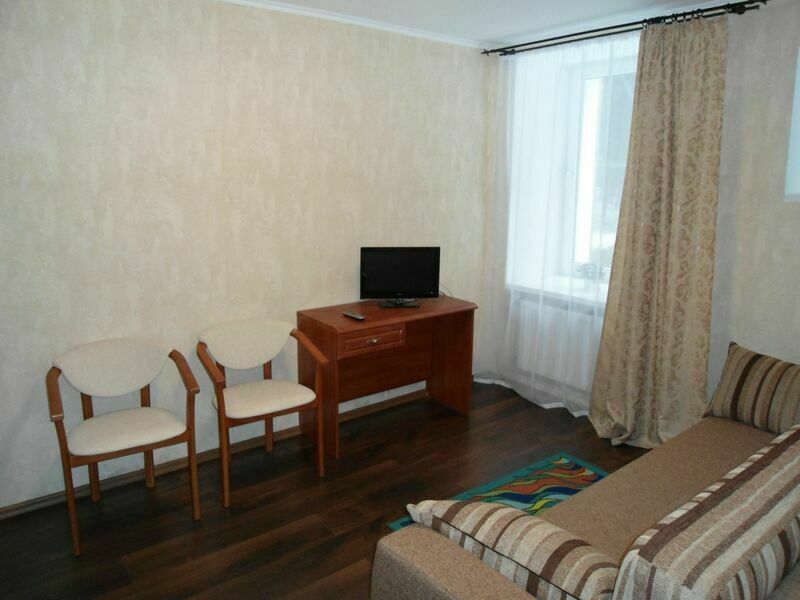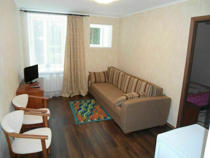 Двухкомнатный номер, с евро-кроватью, телевизором, с мягким уголком, шкаф, трюмо, стол с двумя стульями, во второй комнате диван и холодильник. Так же в номере есть санузел.