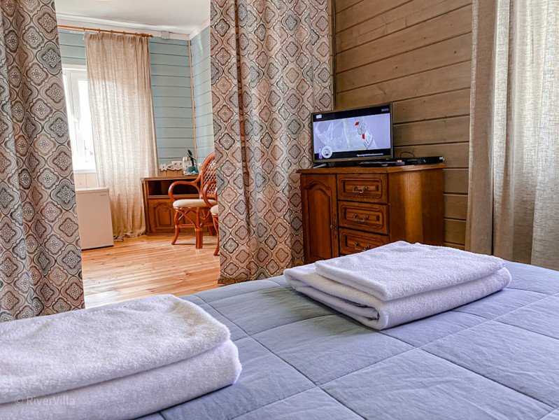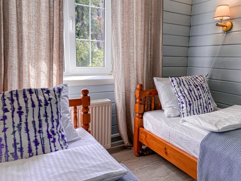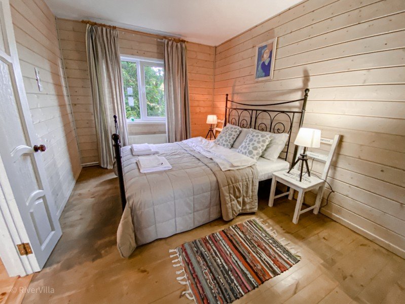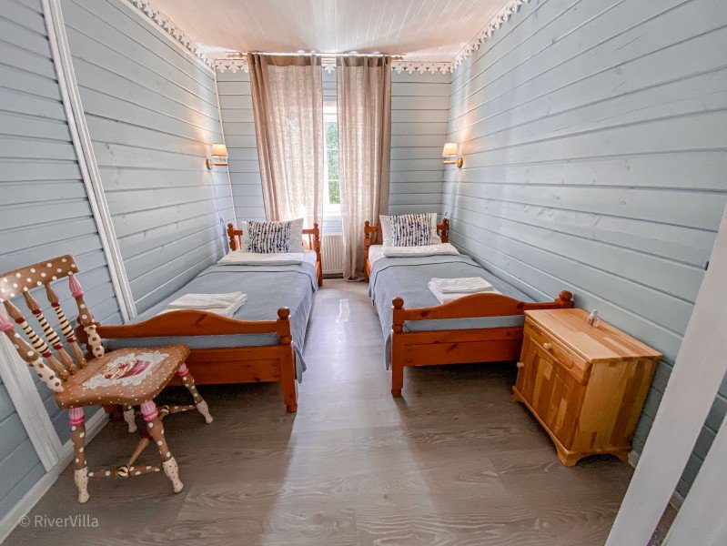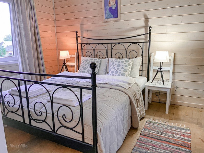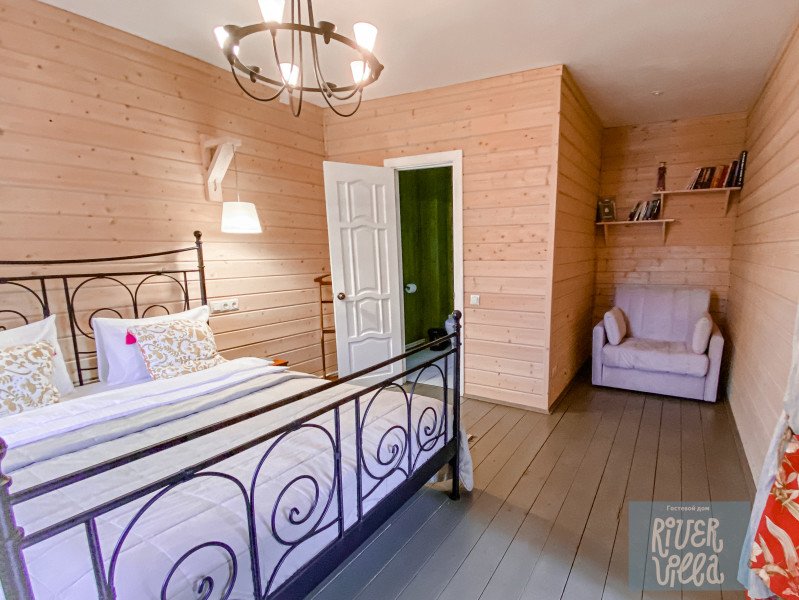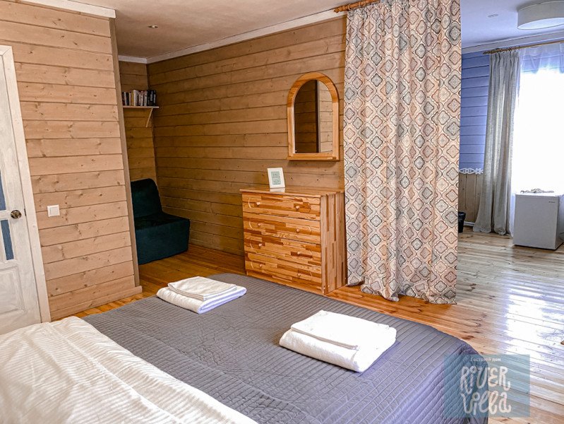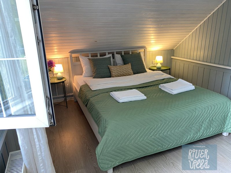 Двухэтажный домик с отдельным входом. На первом этаже спальня с двумя односпальными кроватями, кухней и санузлом с душевой кабиной. На втором этаже: спальня с двухспальной кроватью, кресло-кровать, диван-кровать, небольшая гостиная и туалет. Вид на реку.