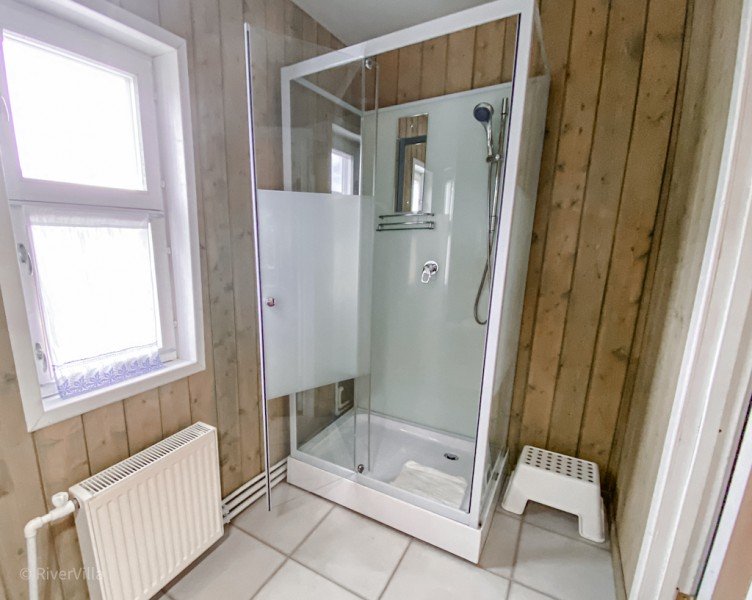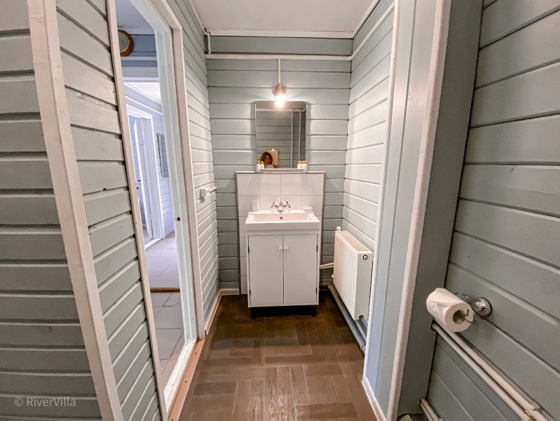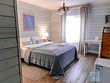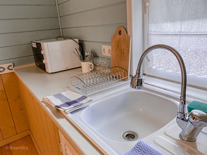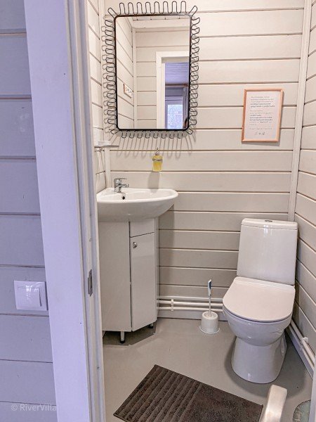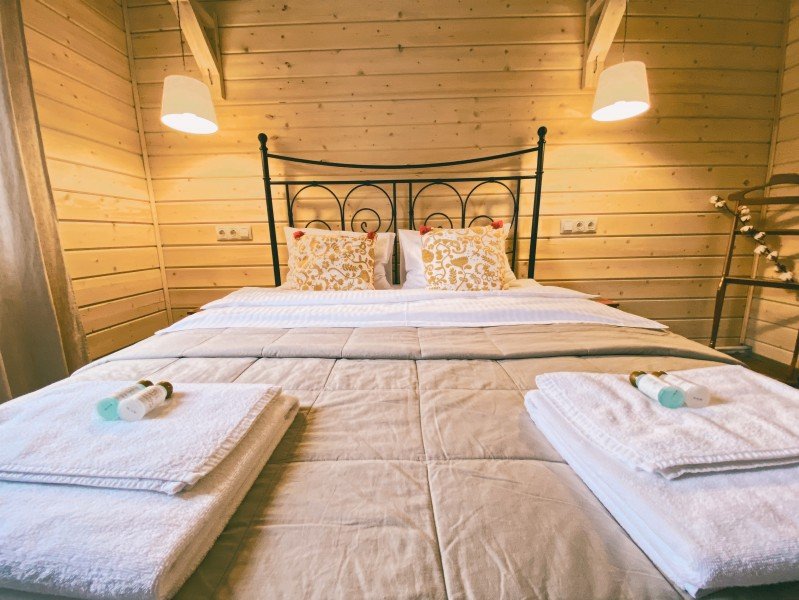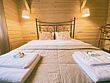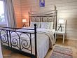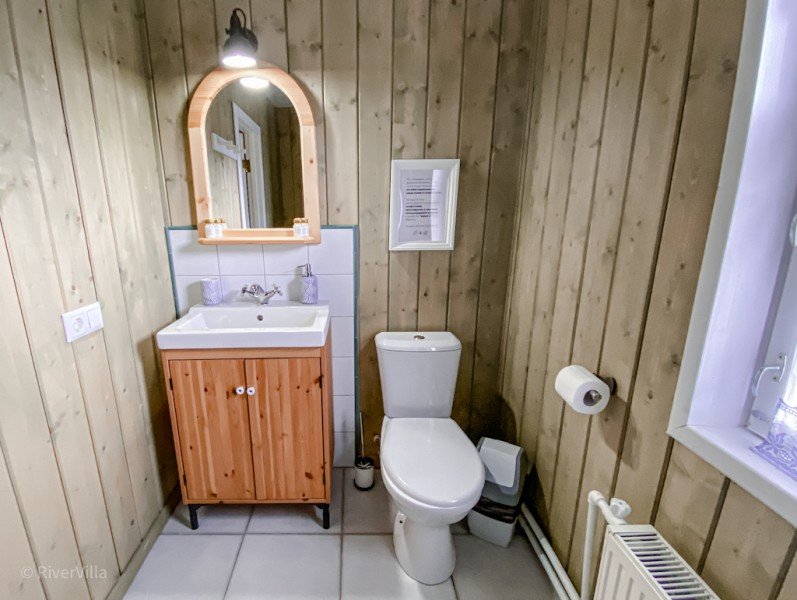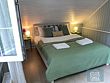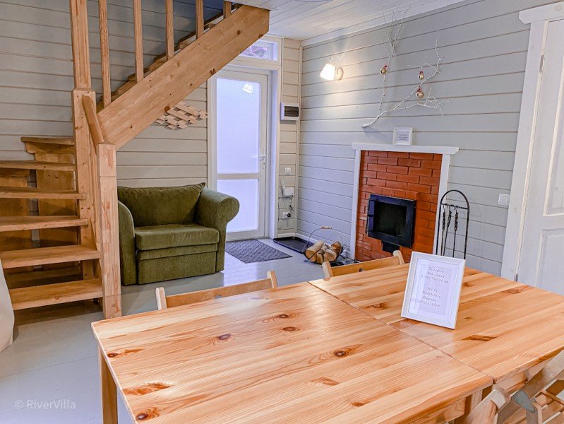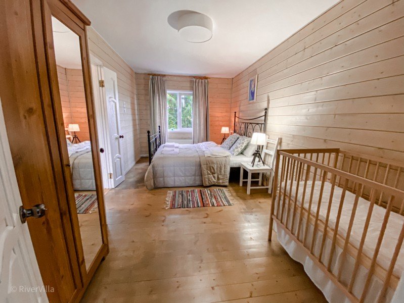 Двухэтажный домик с отдельным входом. На первом этаже спальня с двумя односпальными кроватями, кухней и санузлом с душевой кабиной. На втором этаже: спальня с двухспальной кроватью, кресло-кровать, диван-кровать, небольшая гостиная и туалет. Вид на реку.