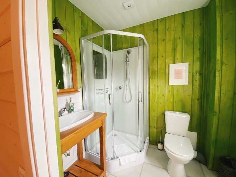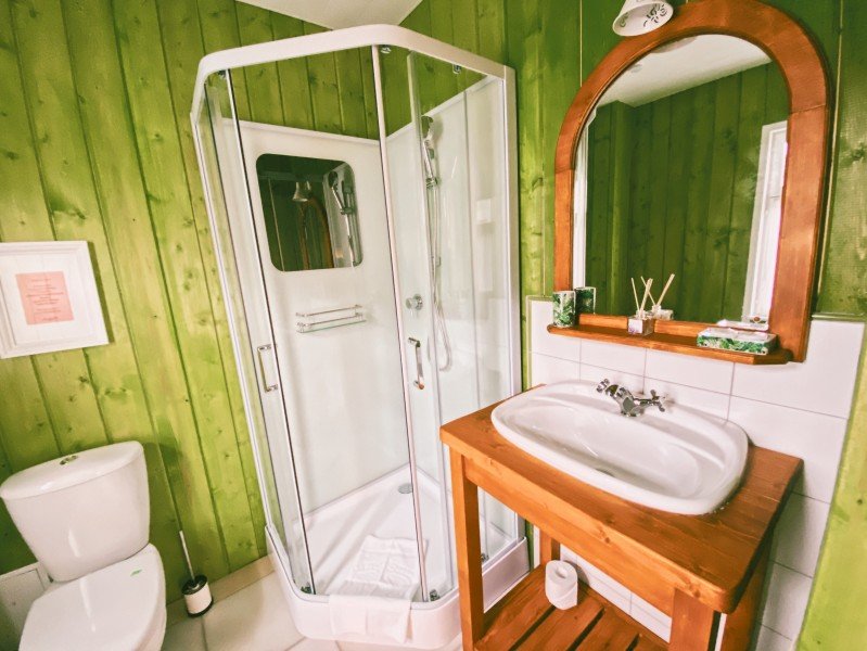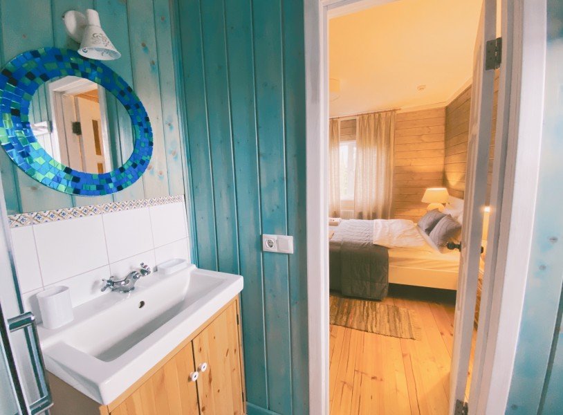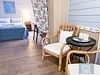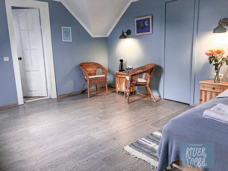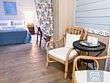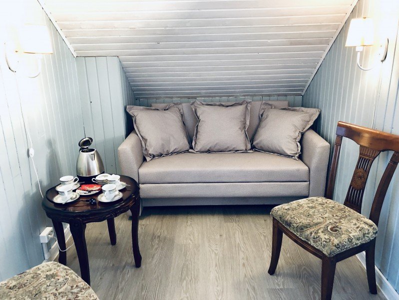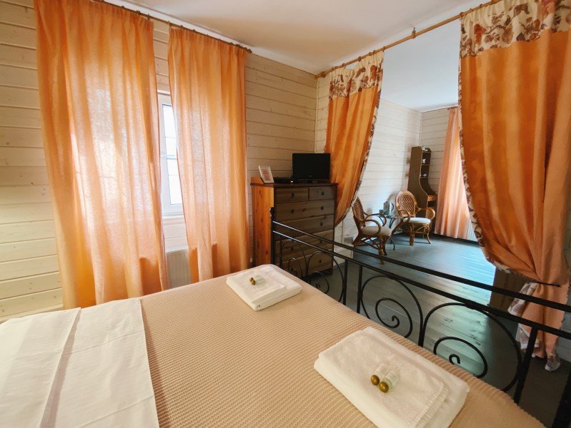 Комната с собственным санузлом (душевая кабина и туалет), большой двуспальной кроватью king-size и дополнительным креслом-кроватью располагается на первом этаже. В комнате есть телевизор, мини-холодильник, небольшая гостиная и принадлежности для чаепития.