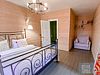 Двухкомнатный семейный номер площадью тридцать пять квадратных метров для четырех человек с мини-кухней. Собственный санузел с душевой кабиной. В номере: чайник, чашки, чай/кофе, микроволновая печь, раковина, мини-холодильник. Двуспальная кровать, детская кроватка и два раскладных кресла.