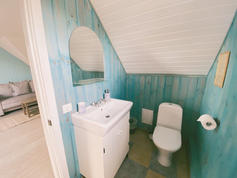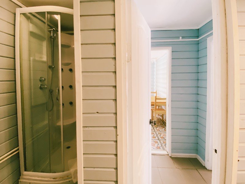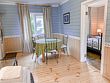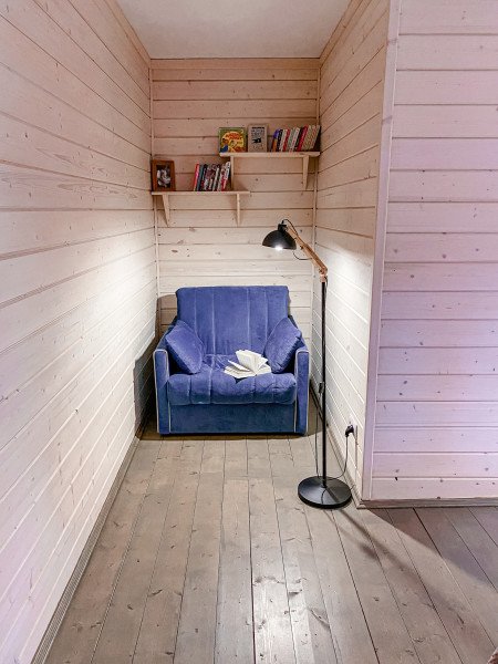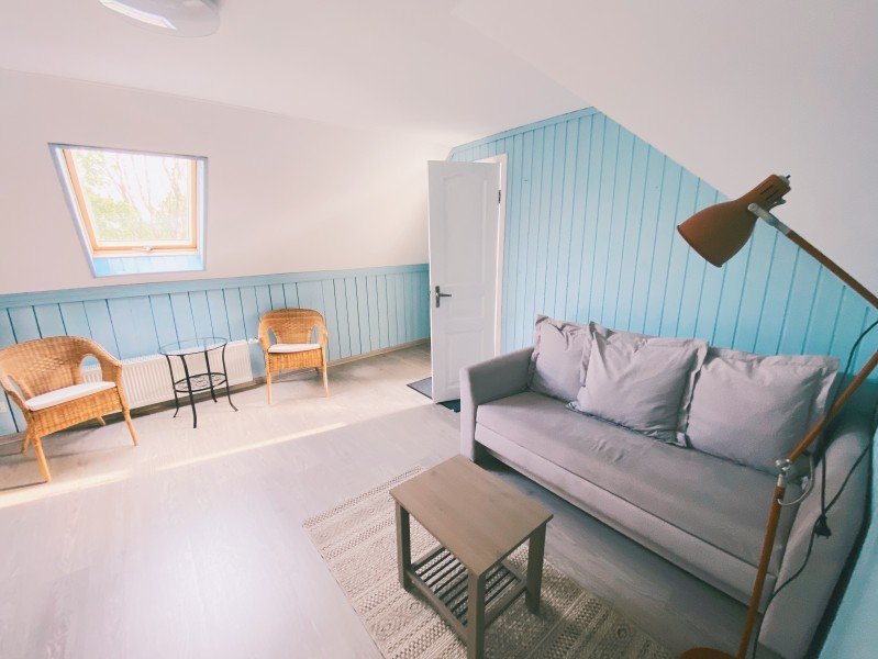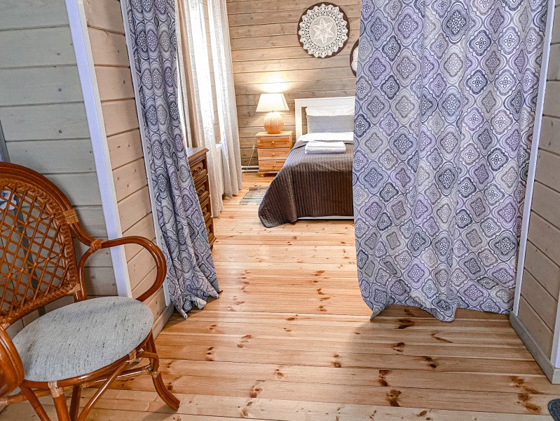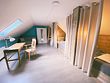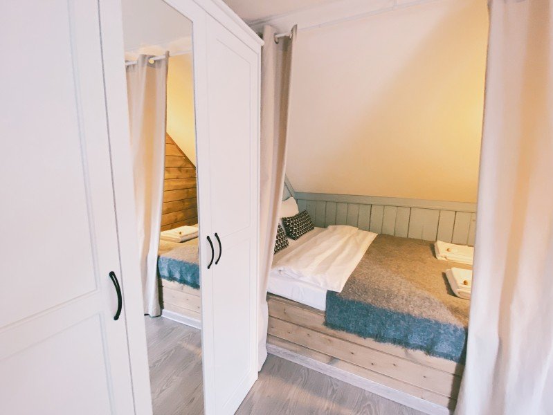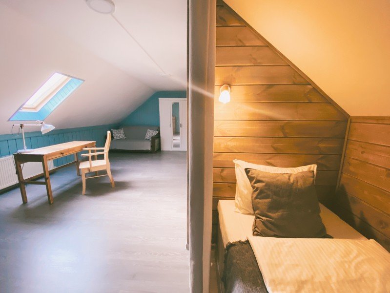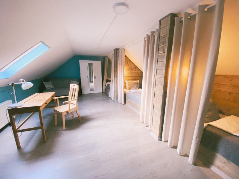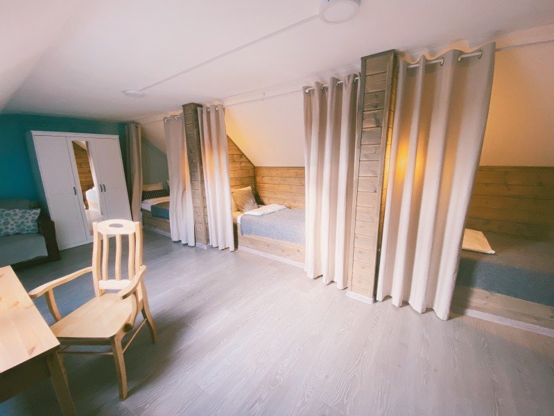 Две смежные комнаты под самой крышей с мансардными окнами, с собственным санузлом и душем. В большой комнате три оригинальные спальные ниши (двуспальная и две односпальных), где за занавеской можно уединиться с книжкой или ноутбуком.