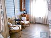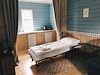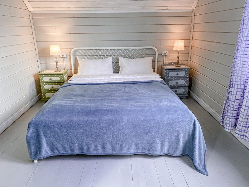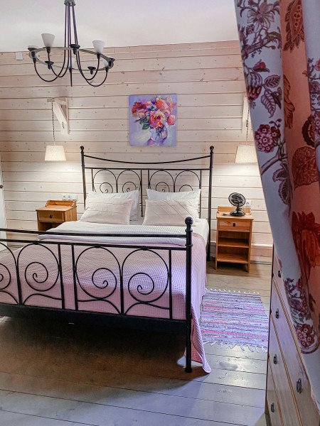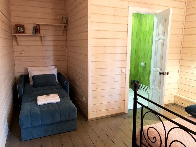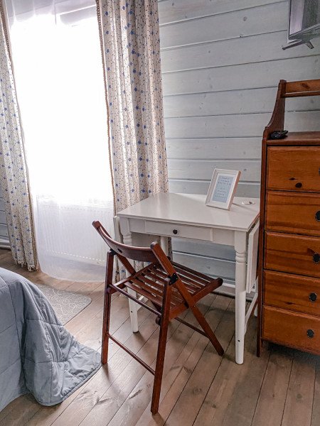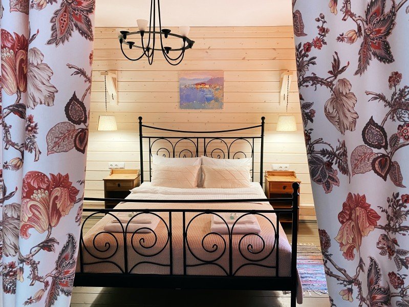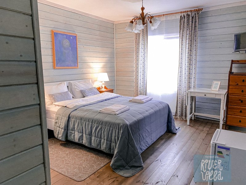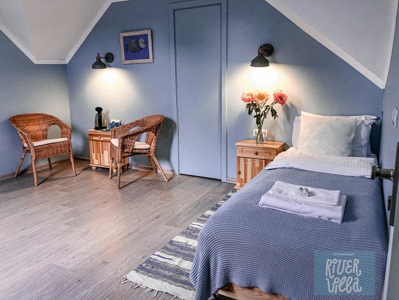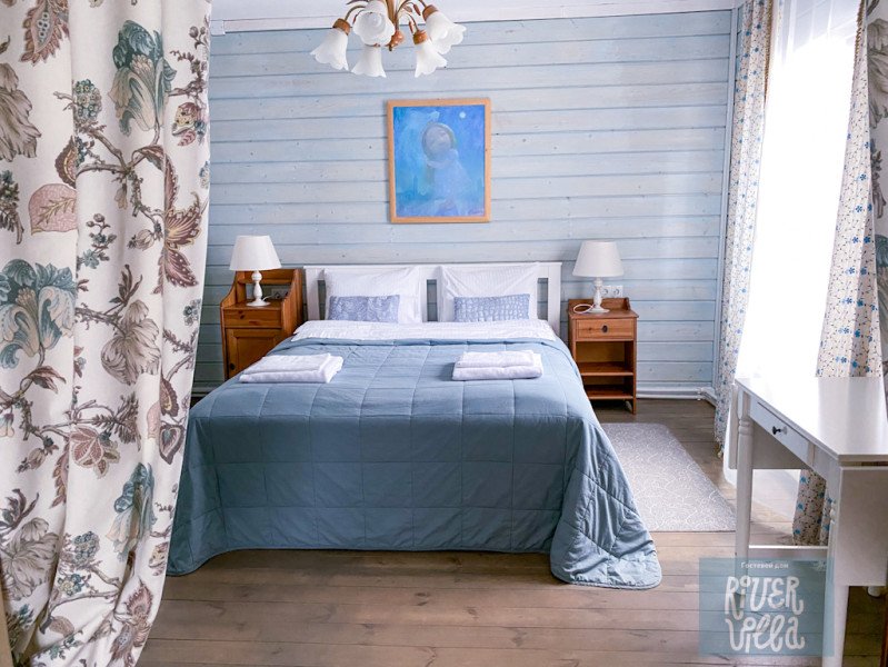 Уютная и светлая комната в голубых тонах с собственным санузлом на втором этаже. Россыпь цветков льна украшает льняные шторы, сделанные на когда-то знаменитой на весь Союз Переславской фабрике вышивки «Новый Мир». А в мае из окошка VIP-вид: ветки большой яблони под окном расцветают пышным цветом.