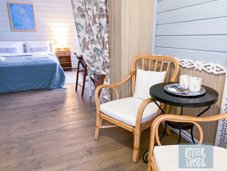Вид из окон — на реку и внутренний дворик. В комнате: большая двуспальная кровать king-size и дополнительное кресло-кровать, телевизор, мини-холодильник, небольшая гостиная и принадлежности для чаепития.