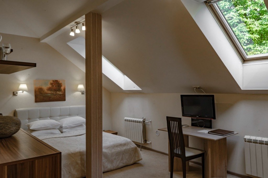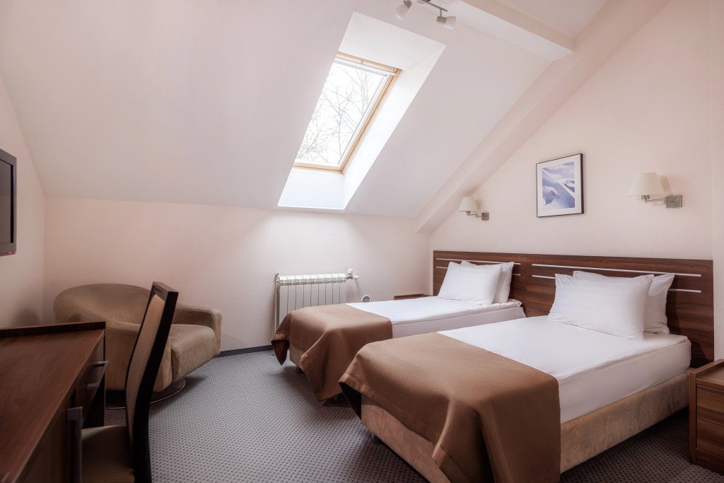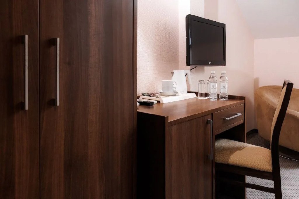 телевизор, кабельное телевидение, Wi-Fi, интернет, кондиционер, фен, электронные замки, обогреватель, душевая кабина, ванна, санузел, халаты, банные полотенца, тапочки, косметические средства, двуспальная кровать, шкаф для одежды, вешалки, журнальный столик, письменный стол, багажная тумба, зеркало, комод, чайник, раковина, кулер на этаже, кресло, стаканы, кофейный столик, тумба, раскладной диван, мини-холодильник, мансардные окна, холодильный шкафВ гостиничном номере