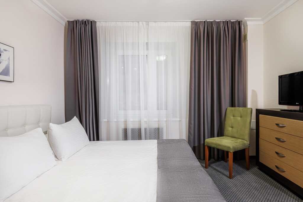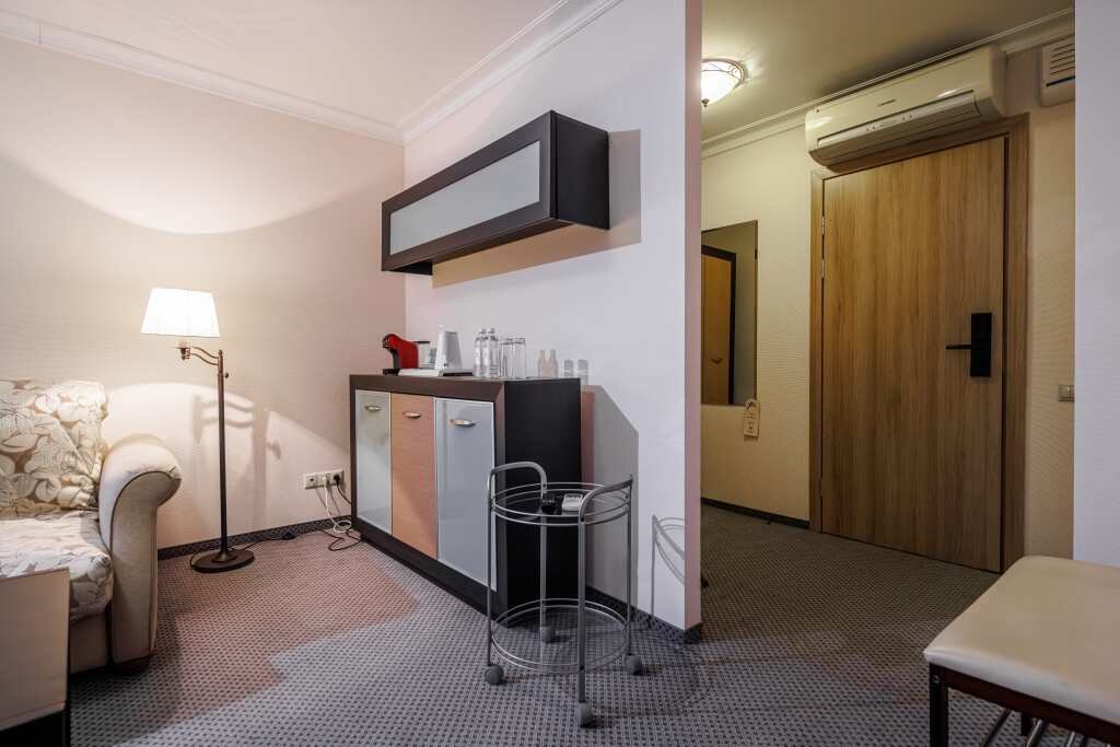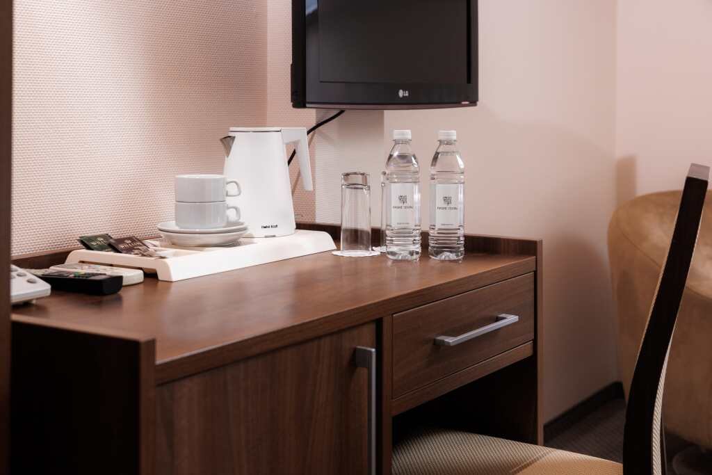 два телевизора, Wi-Fi, телефон, кондиционер, настольные лампы, фен, электронные замки, кофемашина, душевая кабина, халаты, банные полотенца, тапочки, косметические средства, кровать «King size», двуспальная кровать, две двуспальные кровати, две односпальные или большая двуспальная кровать, ортопедический матрас, диван, шкаф для одежды, багажная тумба, зеркало, комод, мягкая мебель, кулер на этаже, стул, тумба, туалетные средства, диван-кровать, раскладной диван, мини-холодильник, телевизор со Smart TV, рабочий стол, чайная станция, вешалки-плечики, мылоВ гостиничном номере