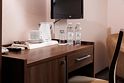 телевизор, кабельное телевидение, Wi-Fi, кондиционер, светильник, фен, душевая кабина, санузел, банные полотенца, тапочки, косметические средства, односпальная кровать, шкаф для одежды, вешалки, письменный стол, багажная тумба, зеркало, чайник, раковина, ковровое покрытие, вид на сад, вид на город, кулер на этаже, кресло, стул, тумба, внутренний телефон, фумигатор, уборка номераВ номере