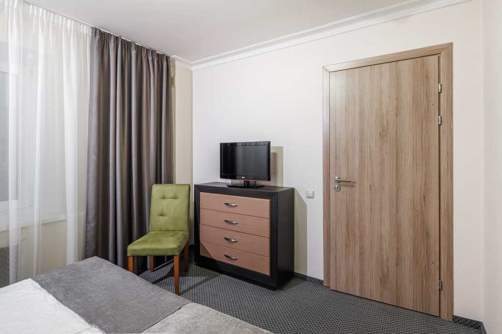 телевизор, кабельное телевидение, Wi-Fi, кондиционер, фен, душевая кабина, санузел, банные принадлежности, банные полотенца, тапочки, косметические средства, двуспальная кровать, две полутораспальные кровати, тумбы, стулья, шкаф для одежды, вешалки, журнальный столик, письменный стол, багажная тумба, зеркало, чайник, раковина, отдельный вход в номер, кулер на этаже, фумигатор, уборка номераВ номере
