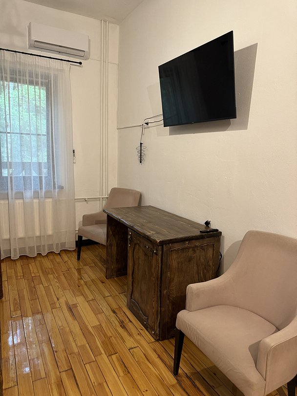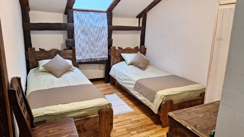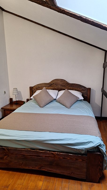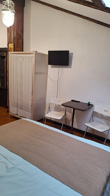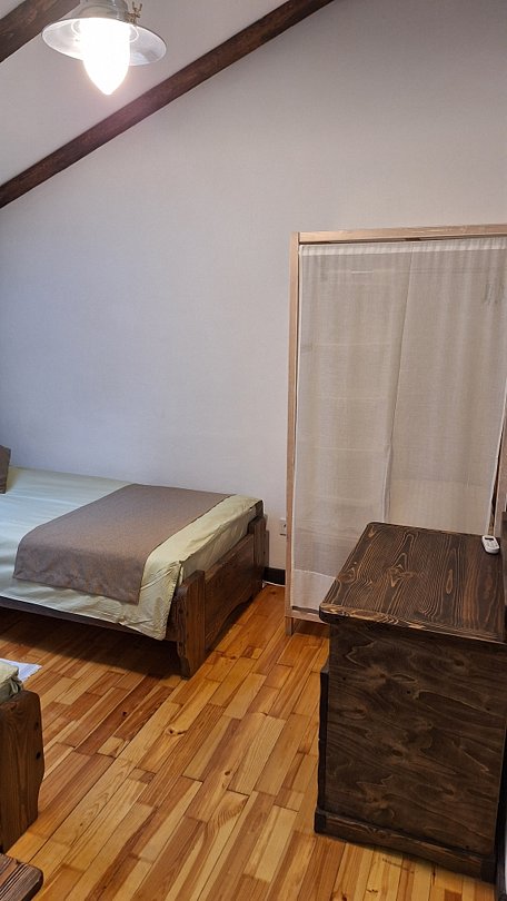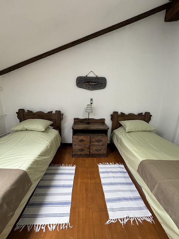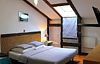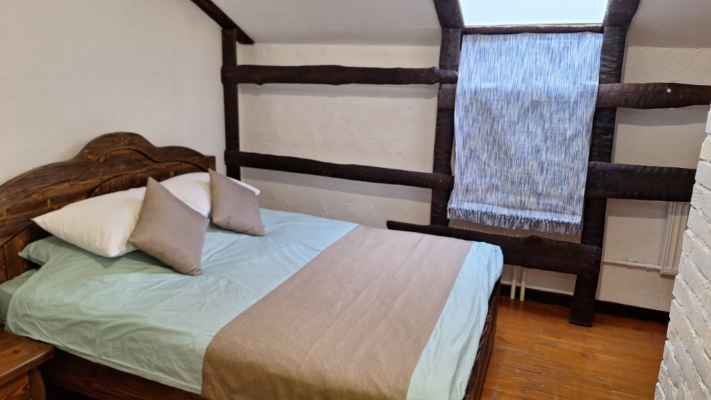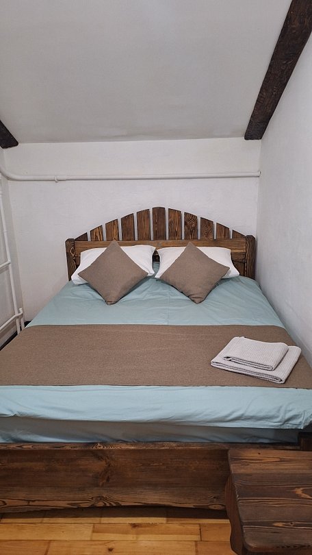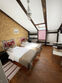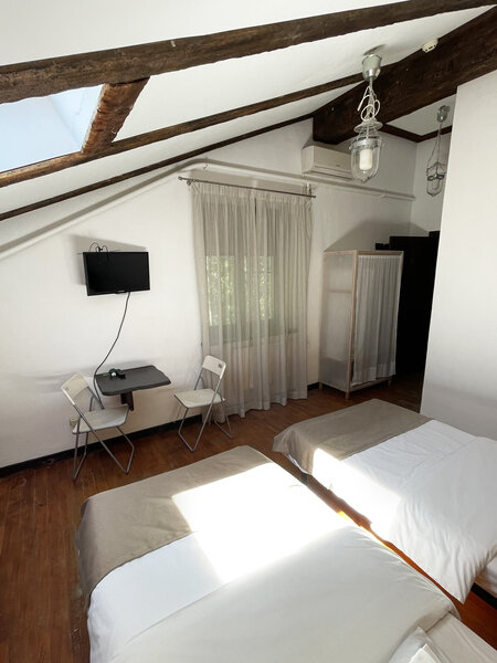 Семейный двухкомнатный номер в мансарде. В одной комнате двуспальная кровать, в другой - две односпальные. Есть кондиционер, ТВ ЖК, холодильник. Санузел с душем, комплект полотенец прилагается.