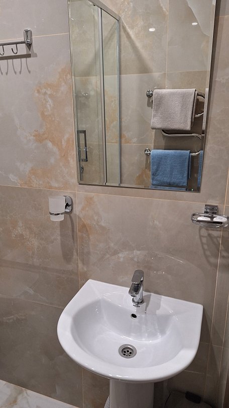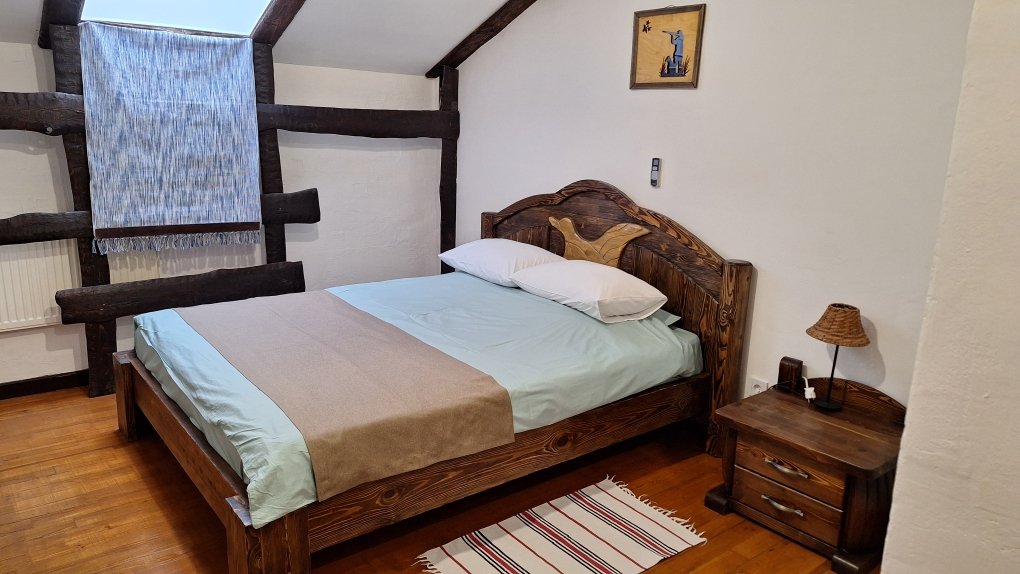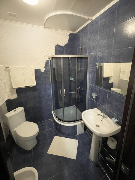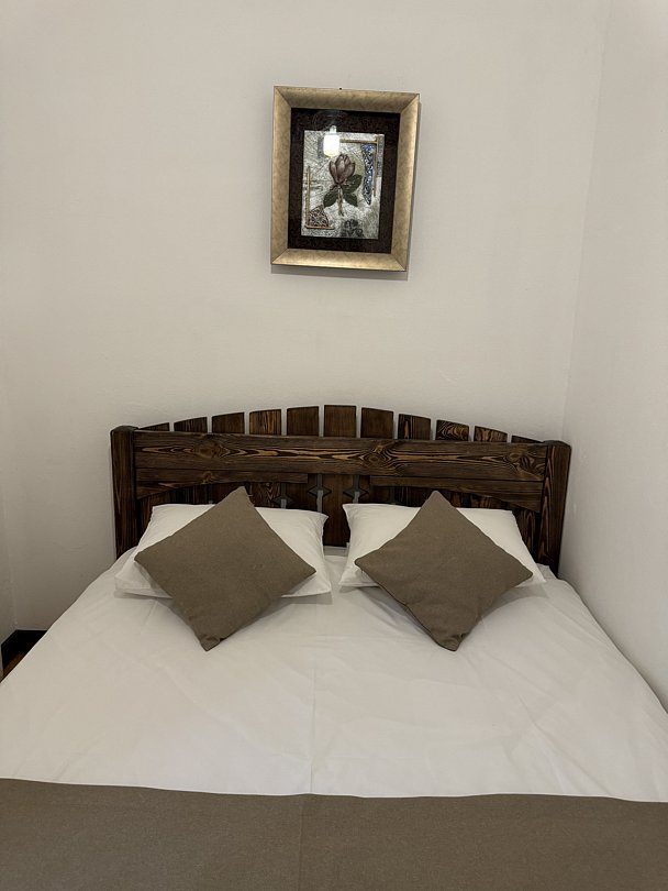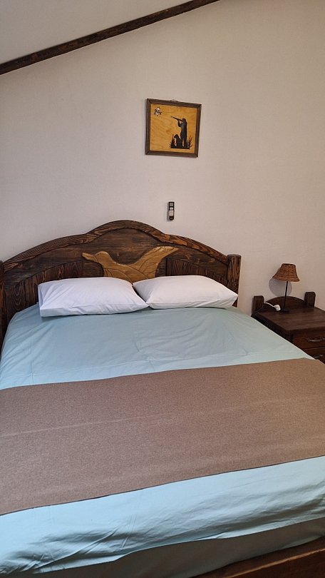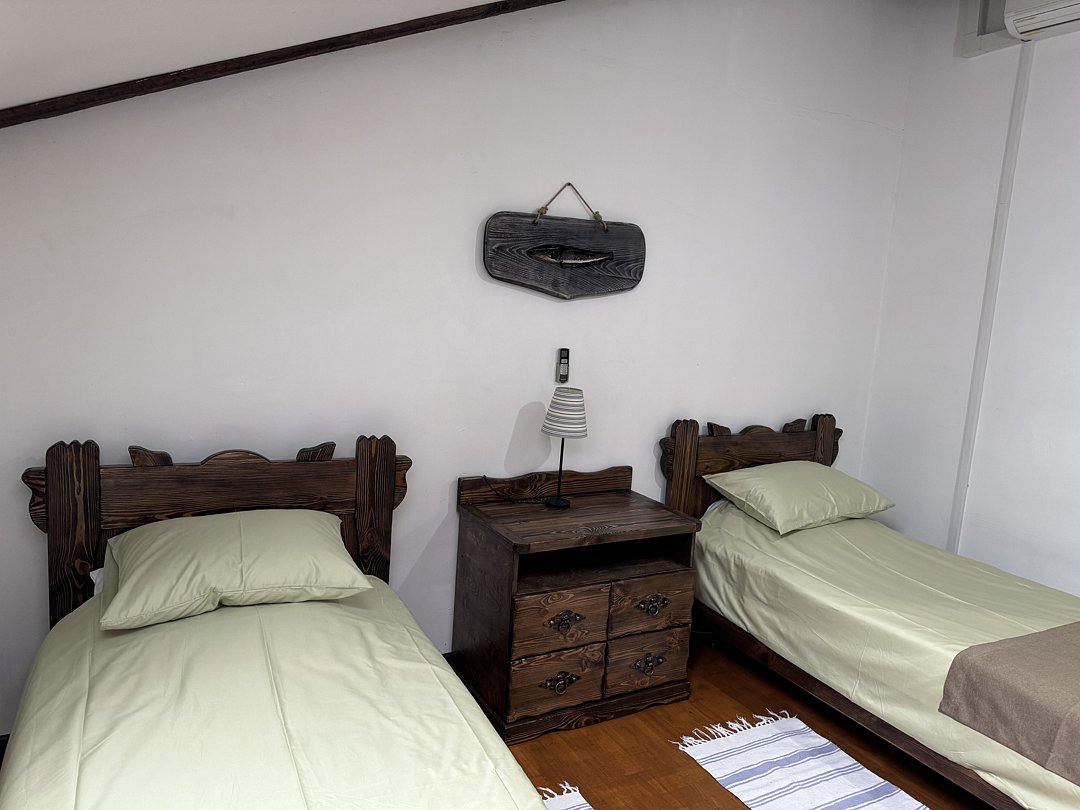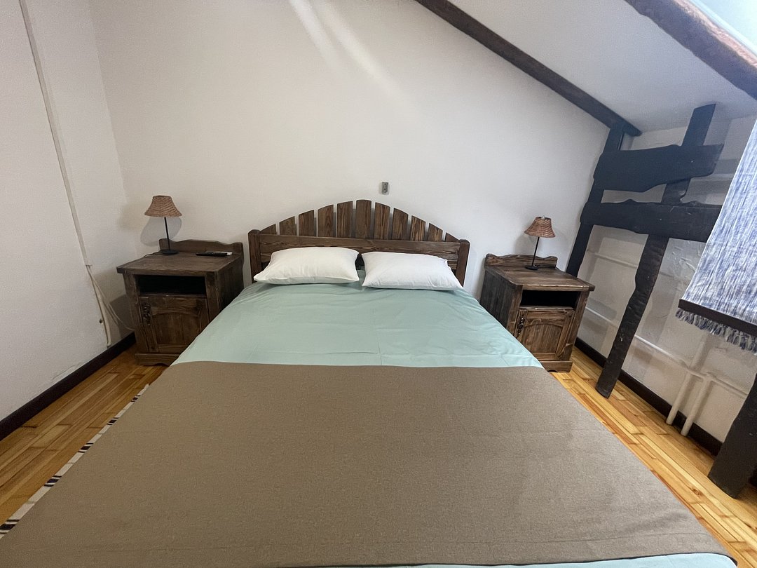 Семейный двухкомнатный номер в мансарде. В одной комнате двуспальная кровать, в другой - две односпальные. Есть кондиционер, ТВ ЖК, холодильник. Санузел с душем, комплект полотенец прилагается.
