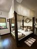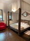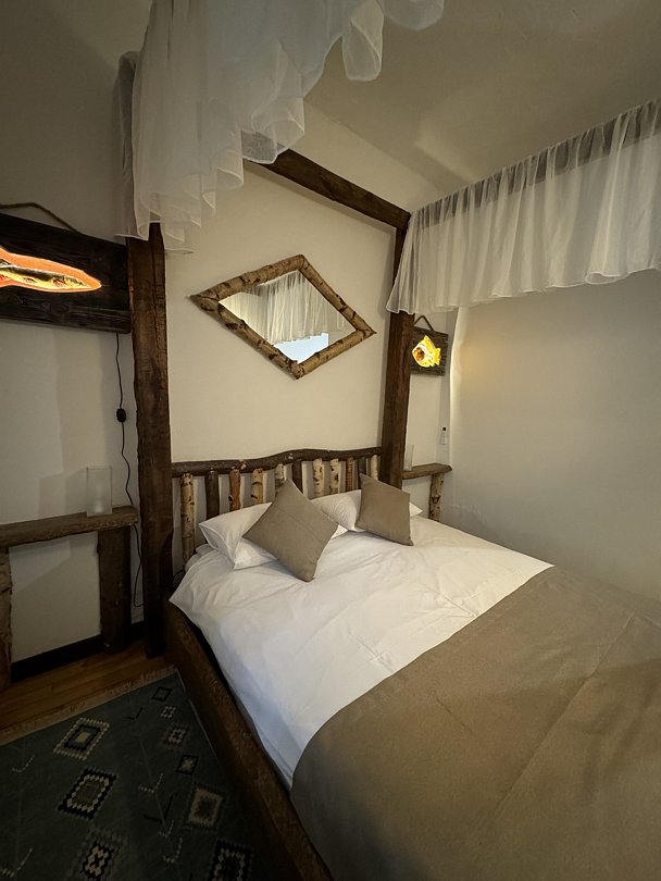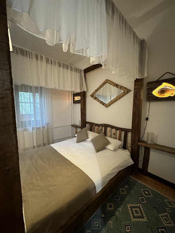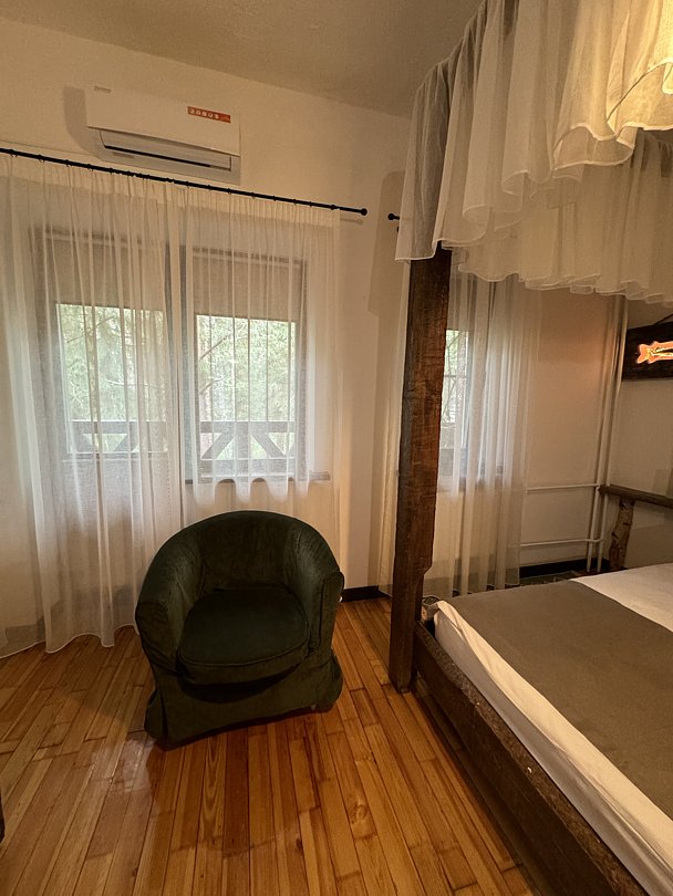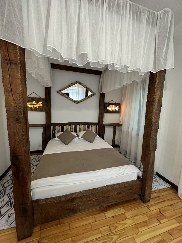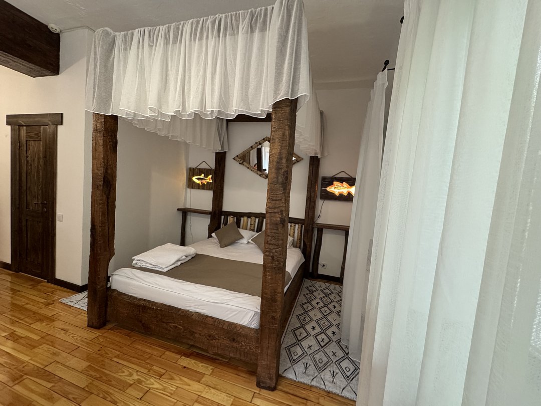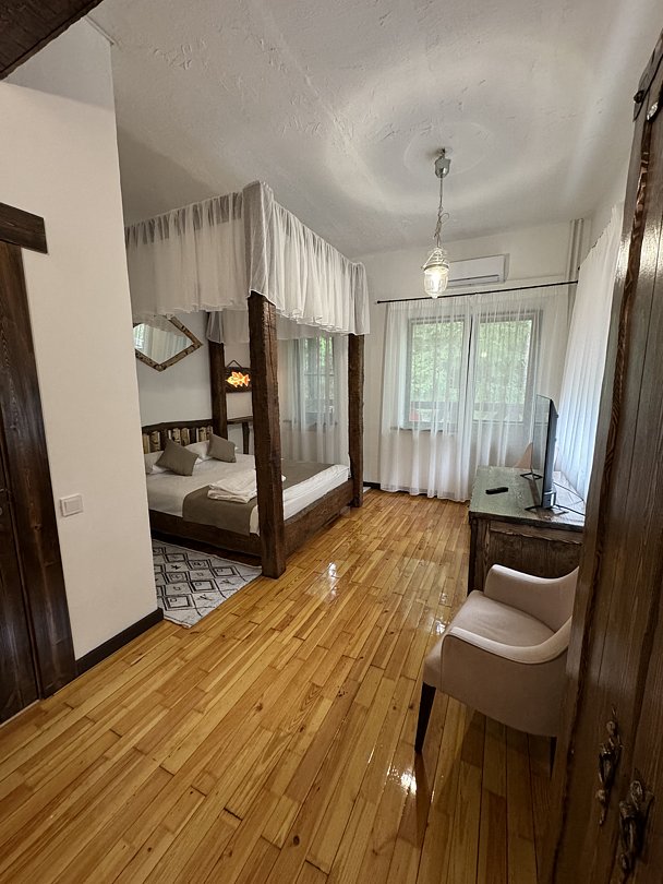 Номер 23 кв. м, с балконом и видом на лес. В номере двуспальная кровать с балдахином, ТВ ЖК, холодильник, санузел с душем и биде, фен. Комплект полотенец прилагается.