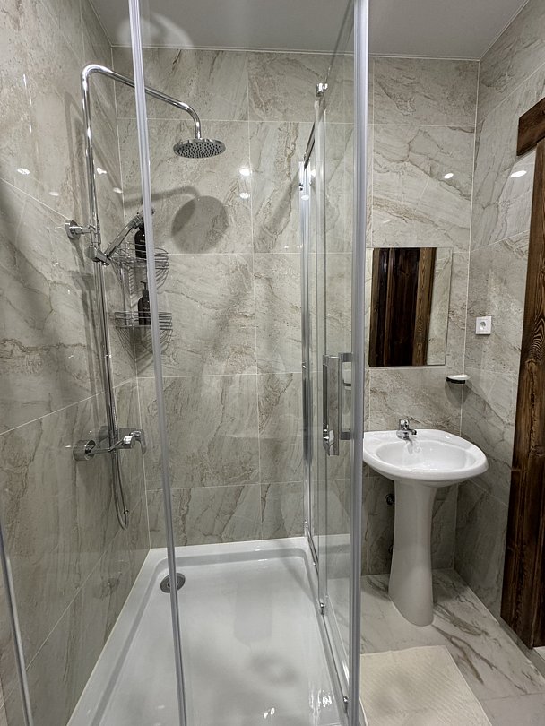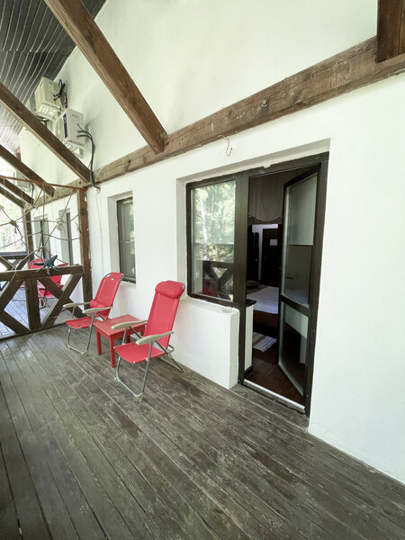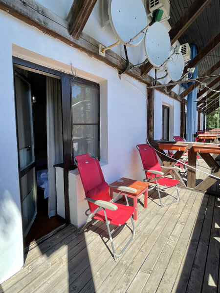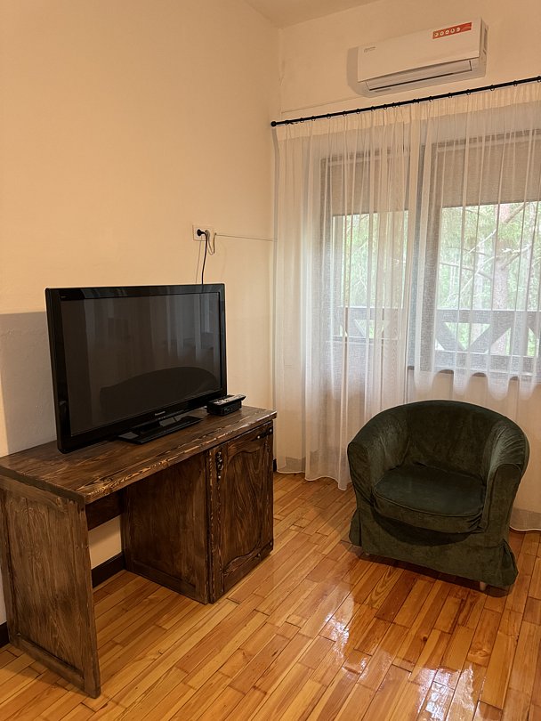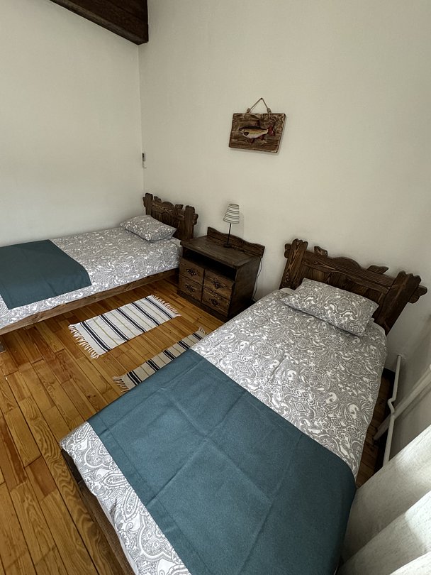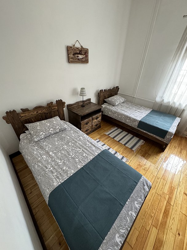 Балкон с видом на лес. В каждой комнате по одной двуспальной кровати. В номере ТВ ЖК, холодильник, фен. Санузел с душем, комплект полотенец прилагается.