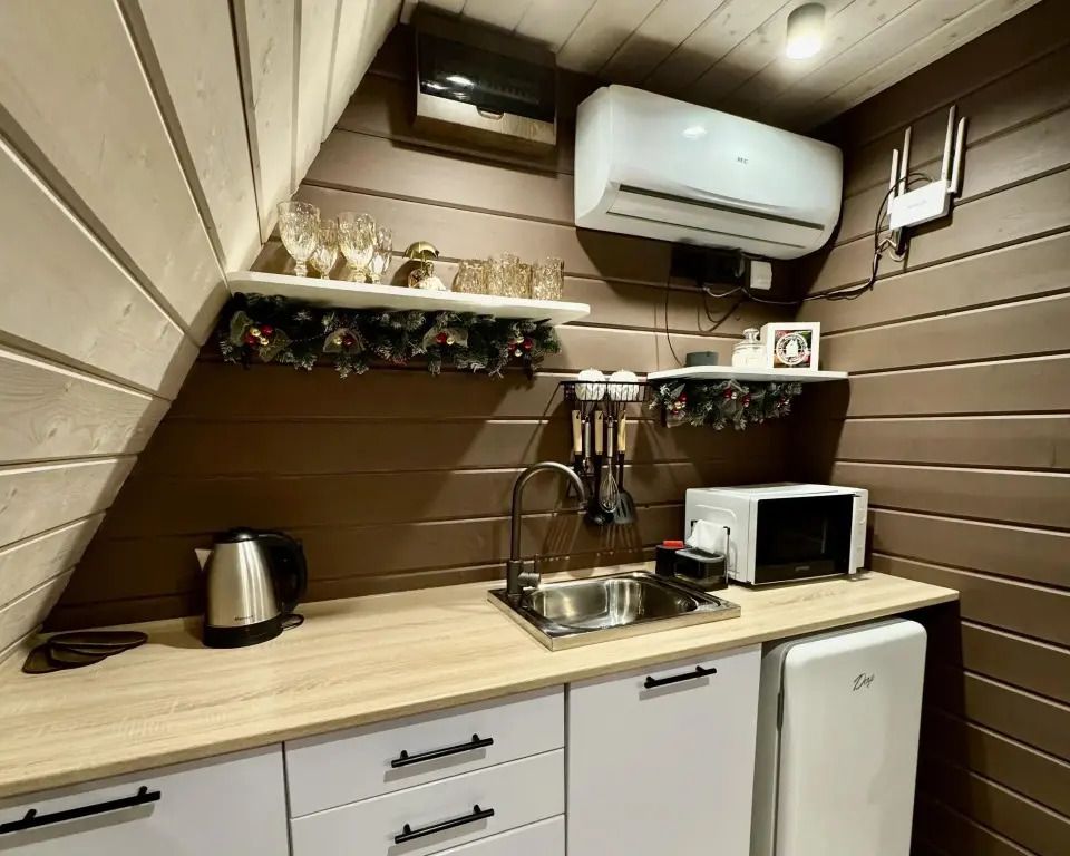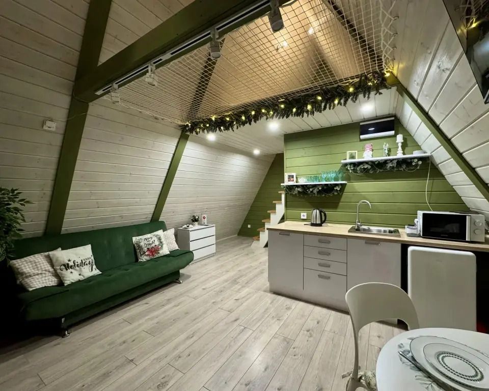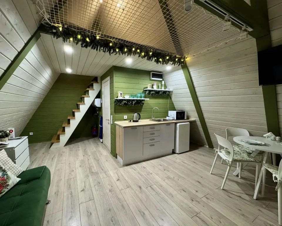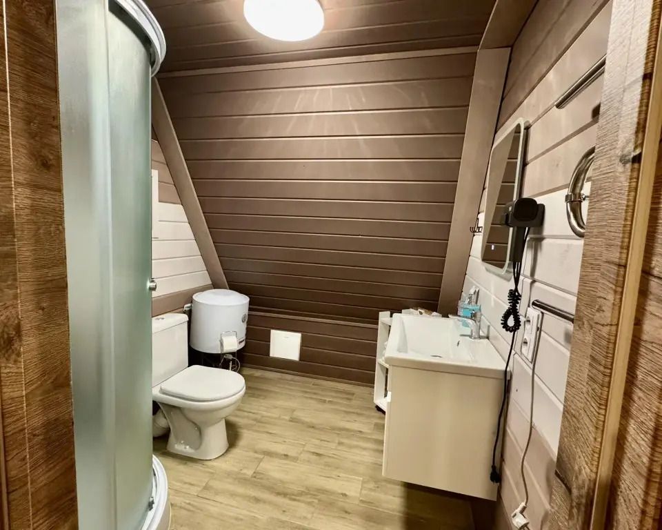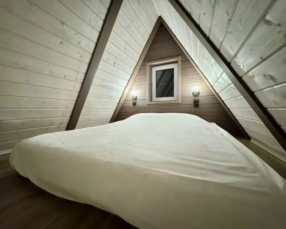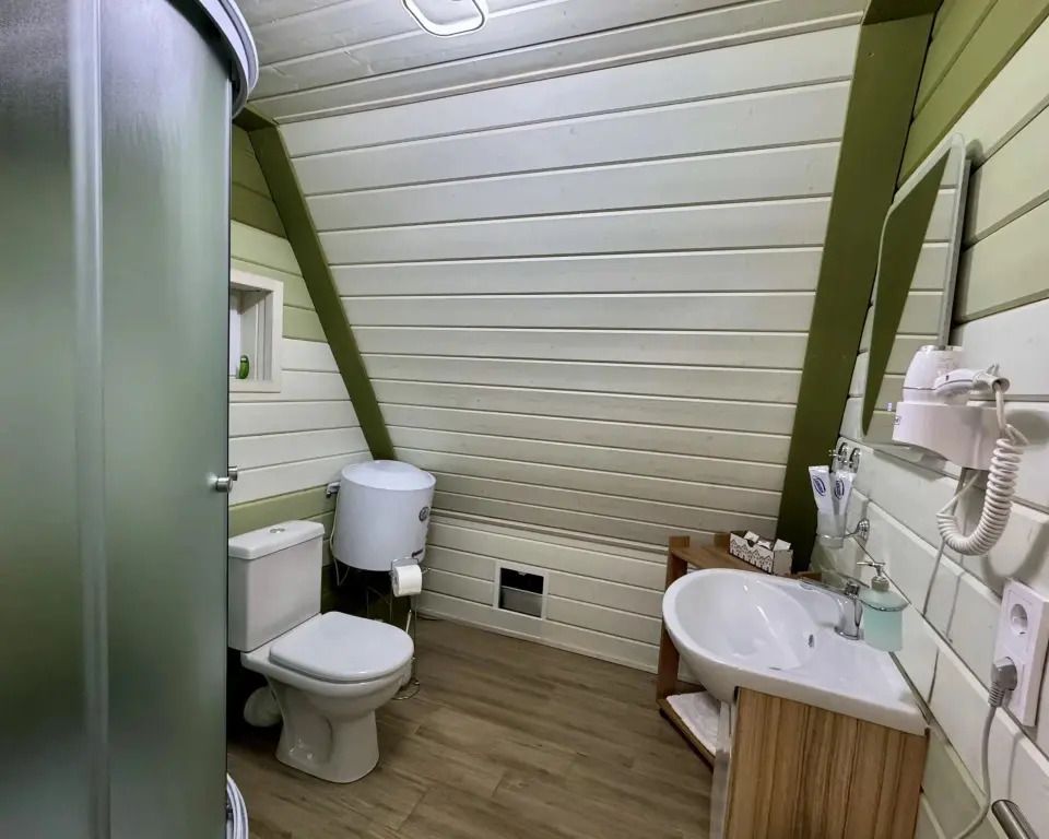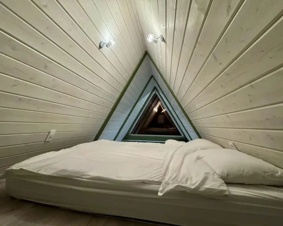 Для гостей подготовлены комфортабельные A-frame, каждый из которых расположен на собственной территории за забором, поэтому если вы давно мечтали об уединенном отдыхе, то это отличное место. Каждый домик оборудован всем необходимым для комфортного проживания. Спальные места представлены кроватью, дополнительно имеется диван. Ванная комната оснащена новой сантехникой, душевой кабиной и туалетными принадлежностями. Установлен кондиционер, в одних домиках есть телевизор, а в других — проектор. Работает Wi-Fi.