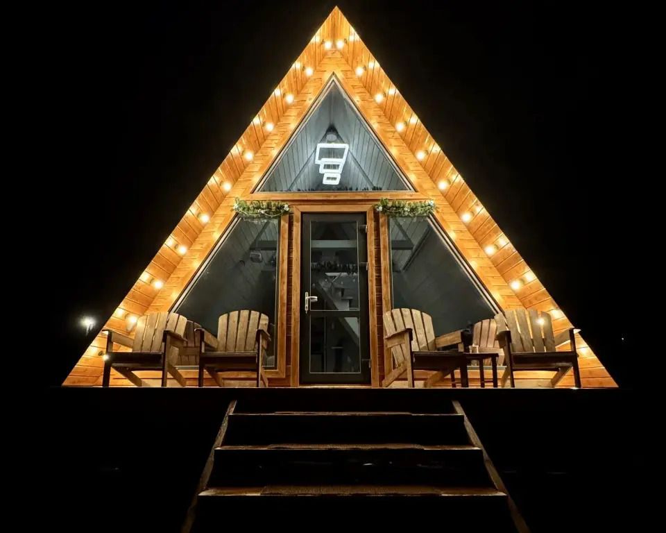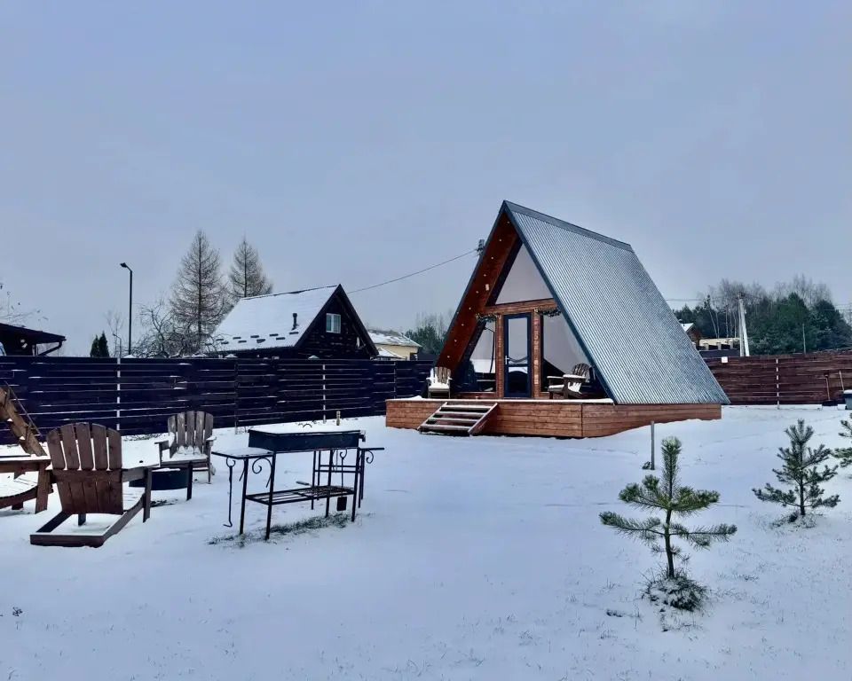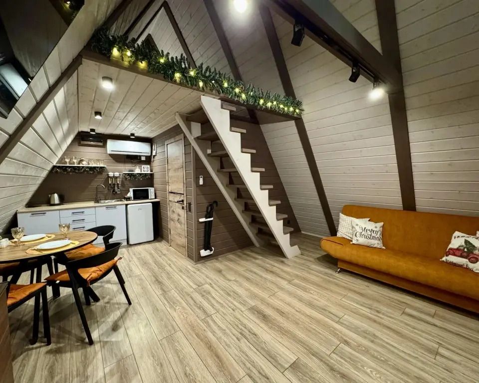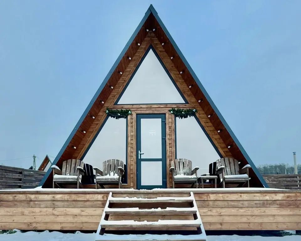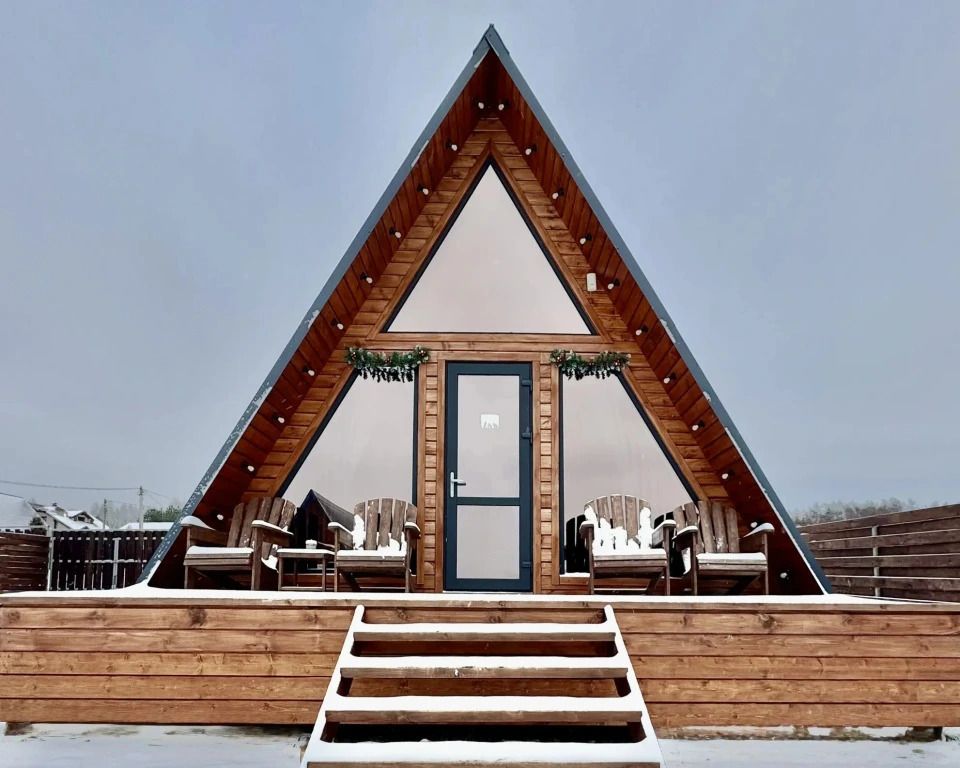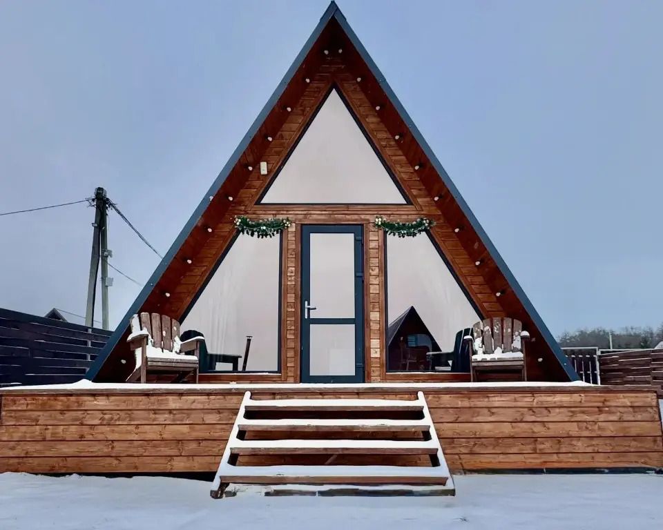 Уютный A-frame с панорамными окнами и дизайнерским интерьером в тёмных тонах.