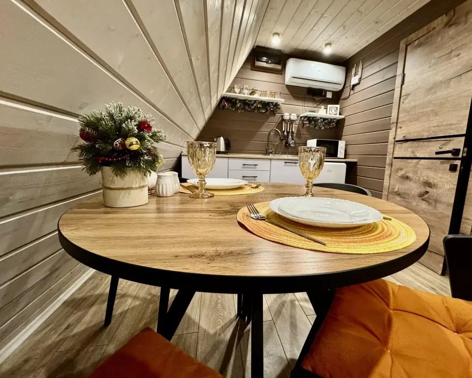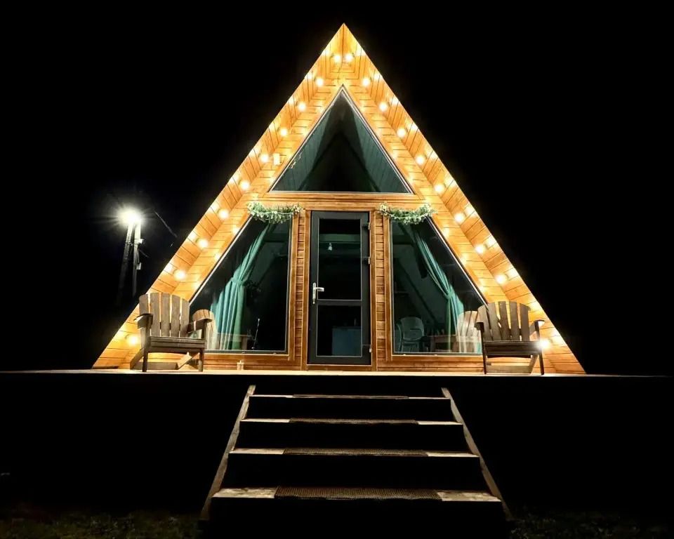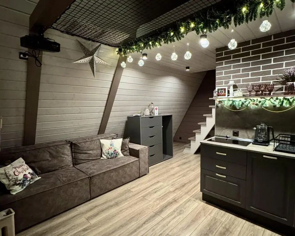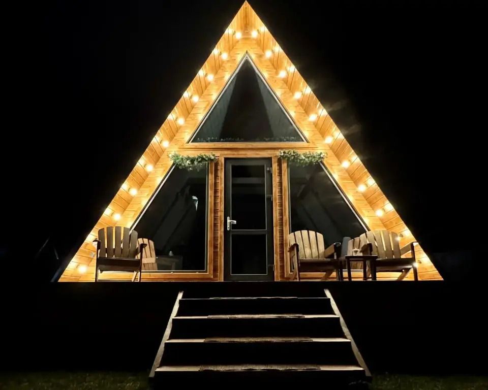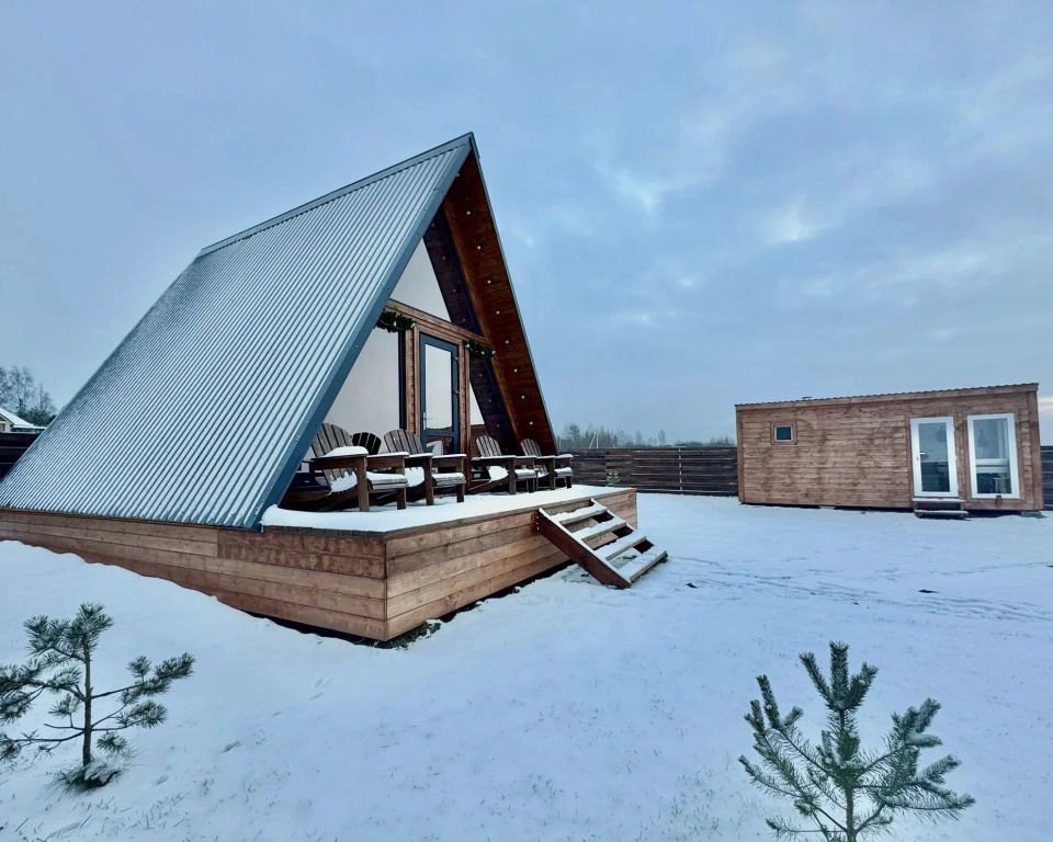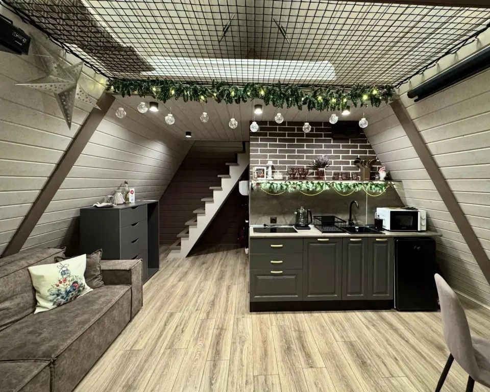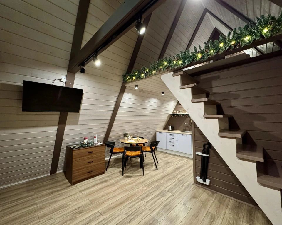 Уютный A-frame с панорамными окнами и дизайнерским интерьером в тёмных тонах.