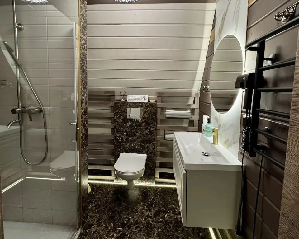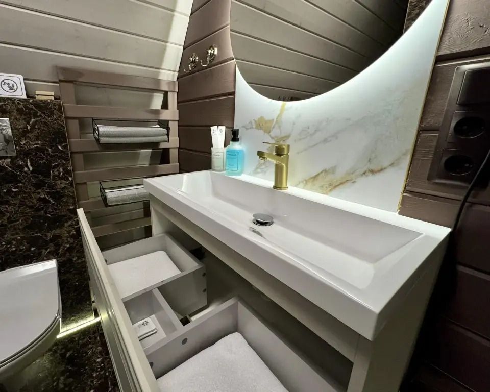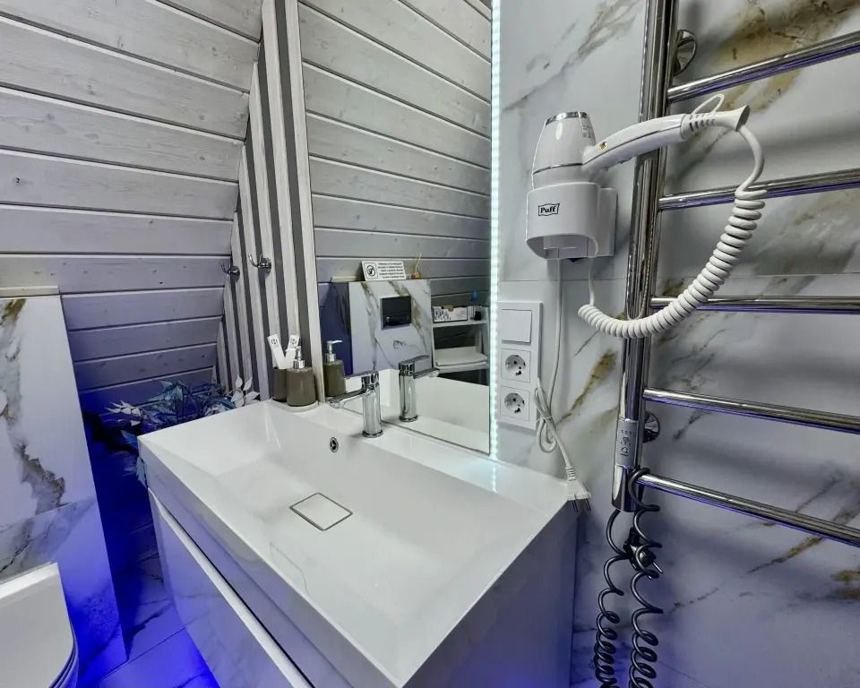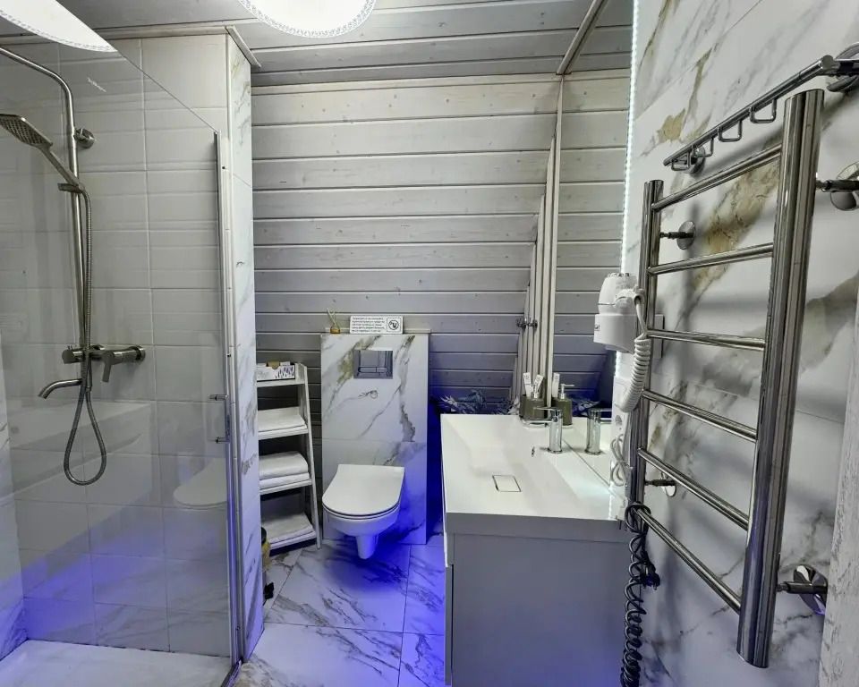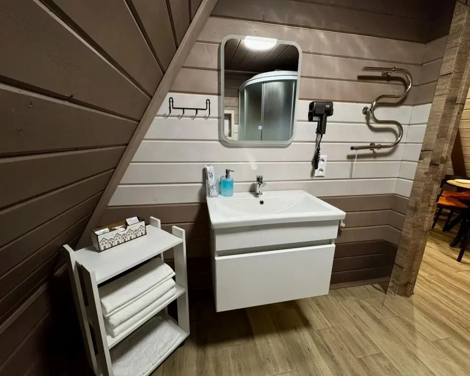 Ванная комната: по 2 полотенца на каждого гостя (банное и для лица), душевой набор на каждого гостя (гель, шампунь, щетка, паста), одноразовые тапочки.
