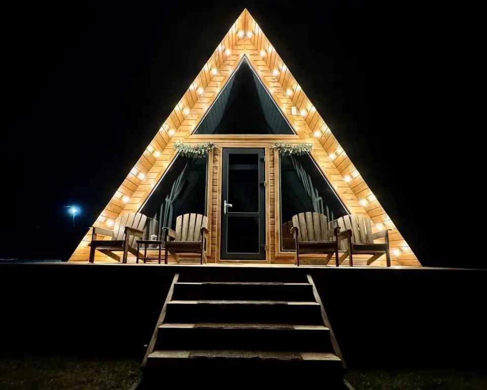 Уютный A-frame с панорамными окнами и современным интерьером в тёмных тонах.