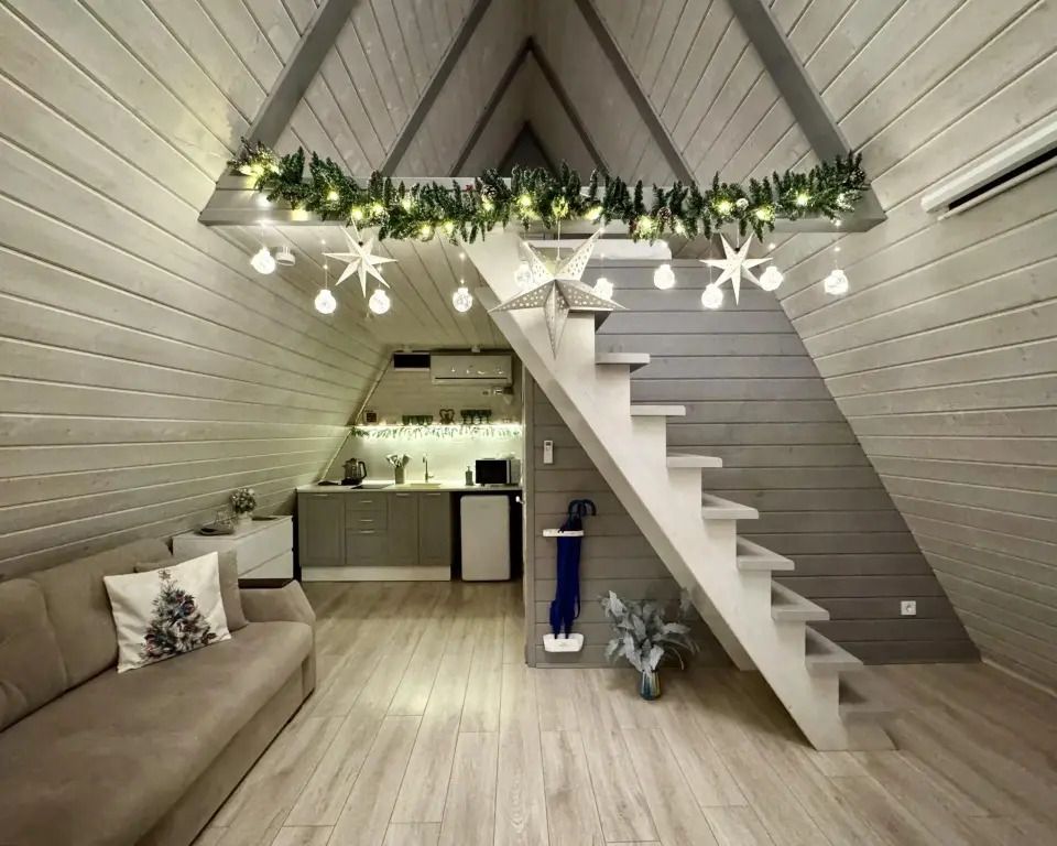 Уютный белый A-frame с панорамными окнами и дизайнерским интерьером в светлых тонах.
