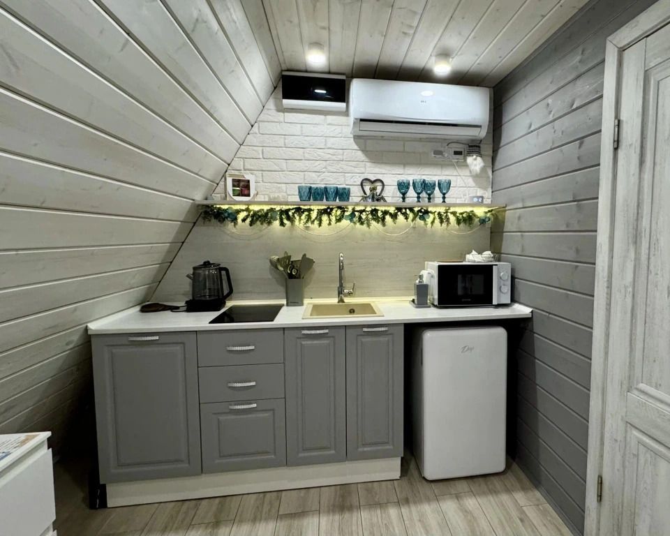 На собственной кухне имеется вся необходимая для готовки бытовая техника. А на прилегающей территории оборудована мангальная зона.