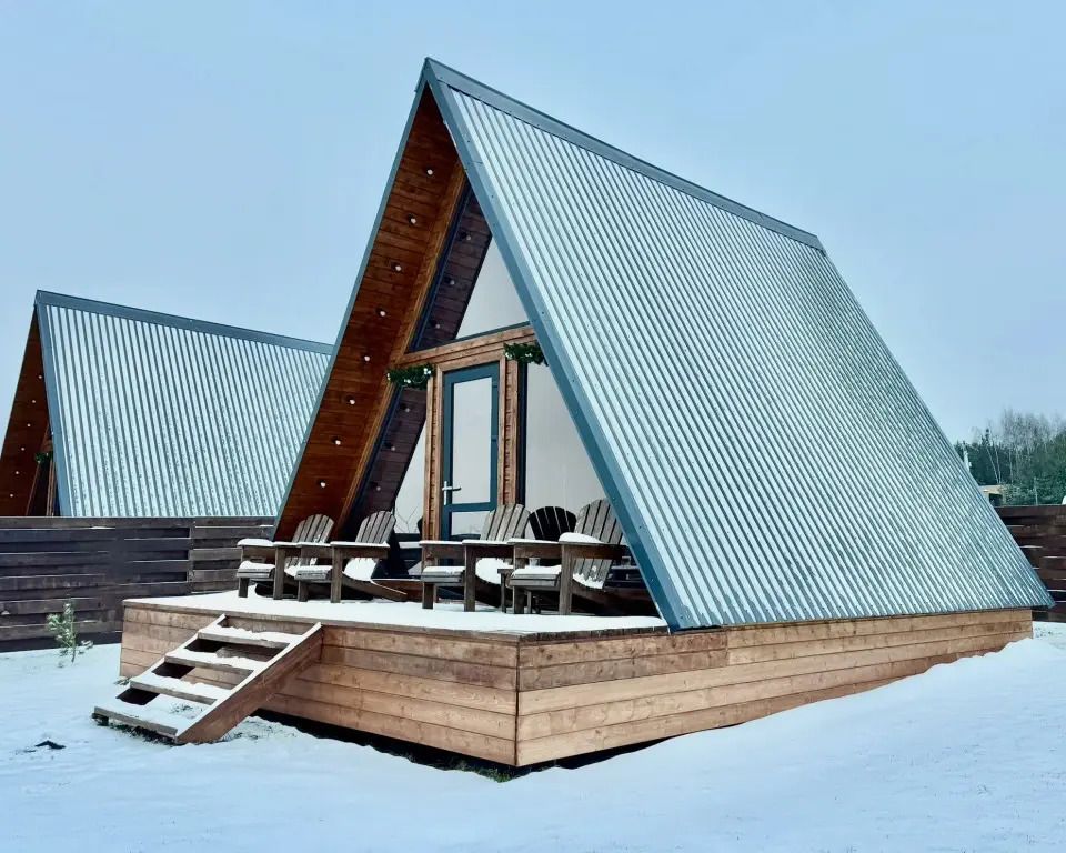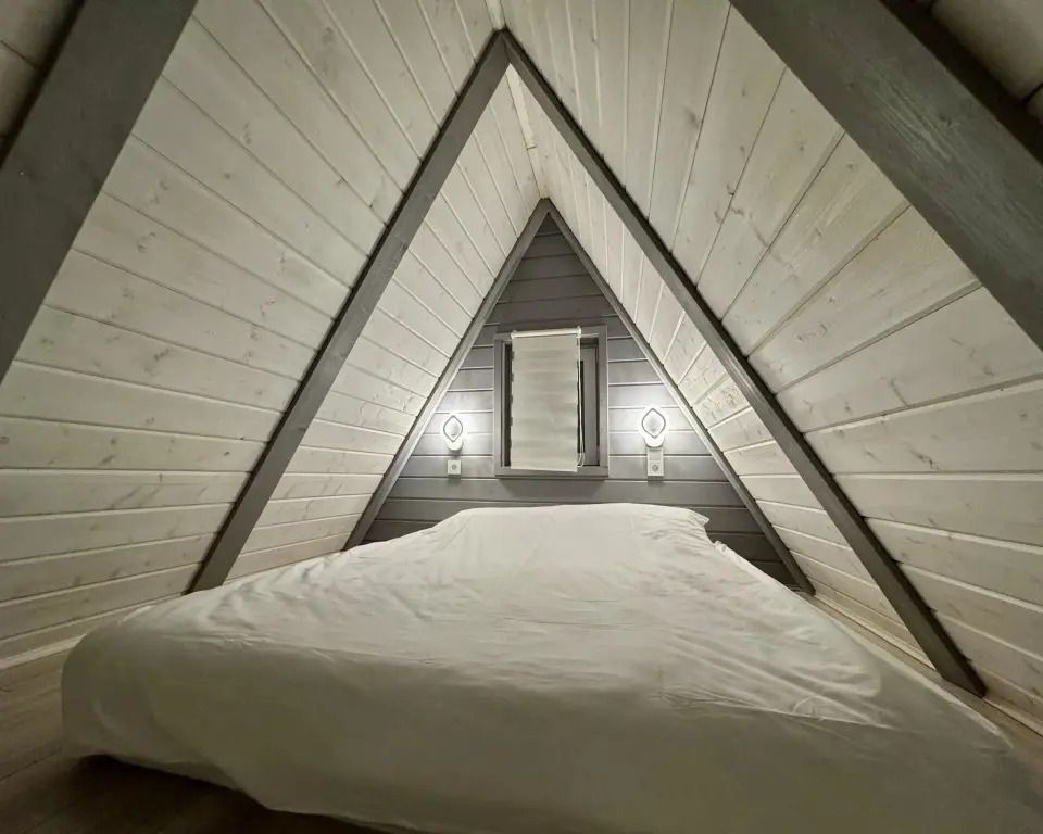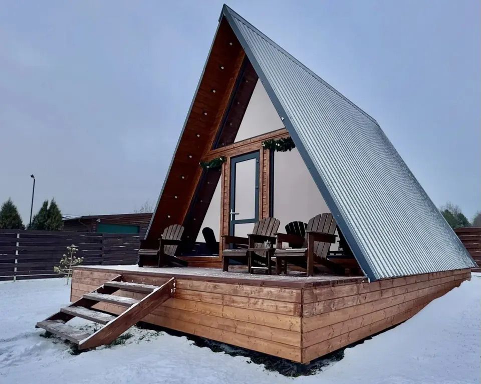 Уютный белый A-frame с панорамными окнами и современным интерьером в светлых тонах.