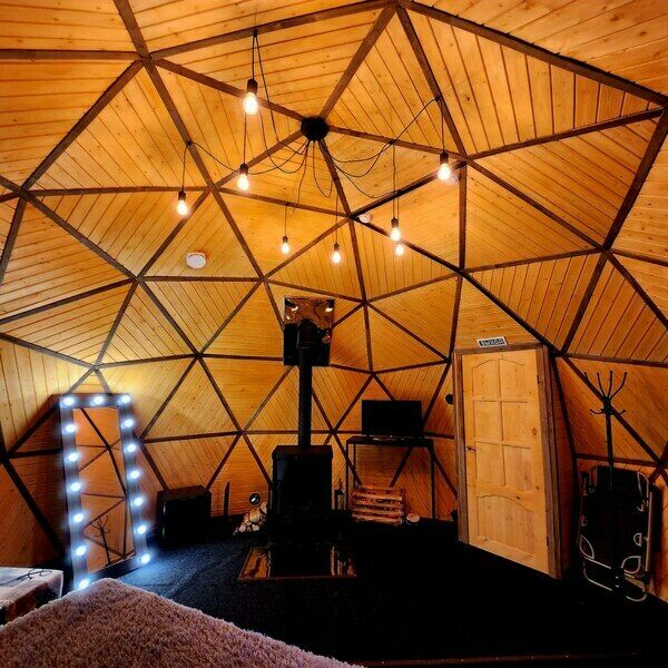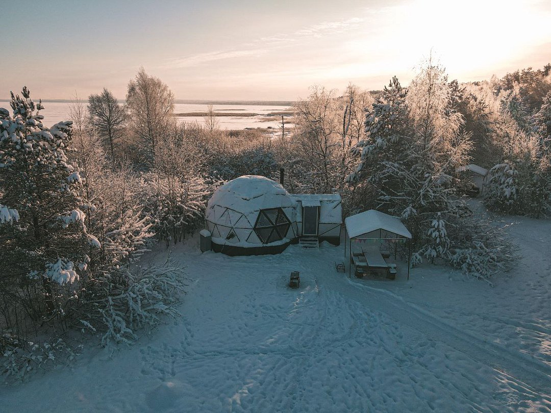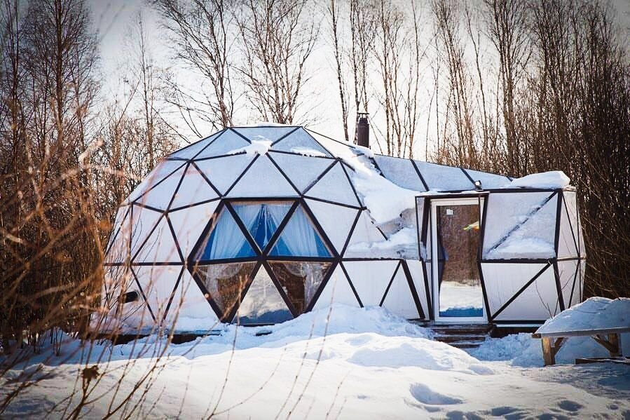 Теплый экодомик в виде геодезического купола Фуллера с камином на дровах, био туалетом, большим панорамным окном, столиком внутри и на улице, мангалом и удобными кроватями.
