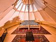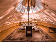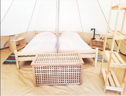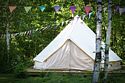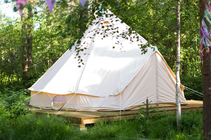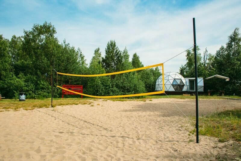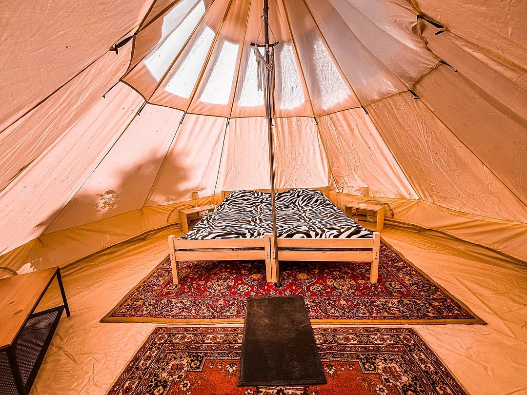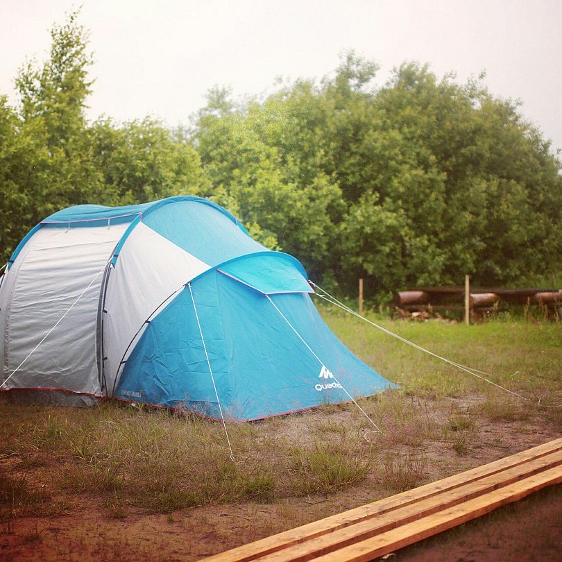 2 комнаты для сна и один общий тамбур. В каждой палатке предоставляются спальные мешки и мягкие теплые коврики. Палатки установлены на подготовленных полянах со скошенной травой, где установлен кемпинговый деревянный стол с лавочками, мангал, дрова. Поляны обработаны от клещей и змей. Полянки расположены в сосновом лесу, до озера около 300 метров, до парковки около 100 метров. Гости могут бесплатно пользоваться инфраструктурой кемпинга: парковка, волейбол, батут, баскетбольное кольцо, пирс, дрова, туалеты.