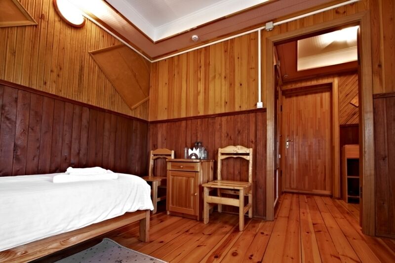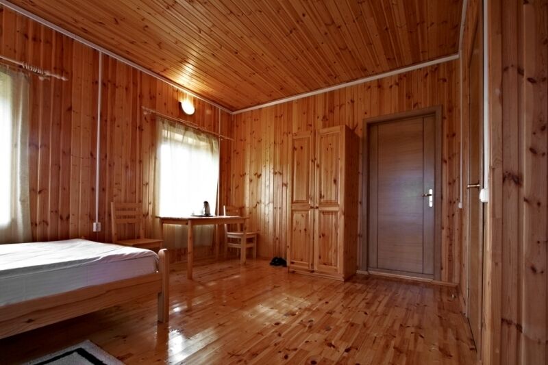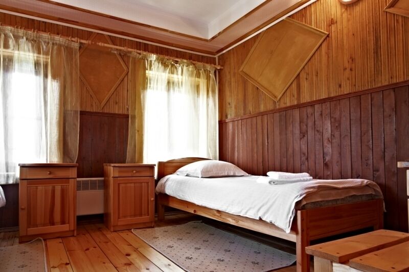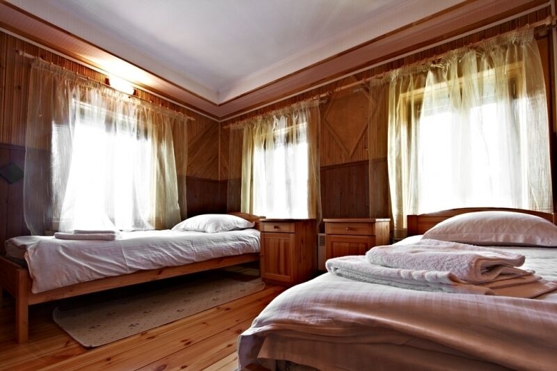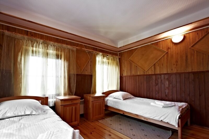 В номерах две полутороспальных кровати, комоды, вешалки для мебели, диван раскладной (используется в качестве основного спального места), телевизор, гостевые тапочки, комплект полотенец.