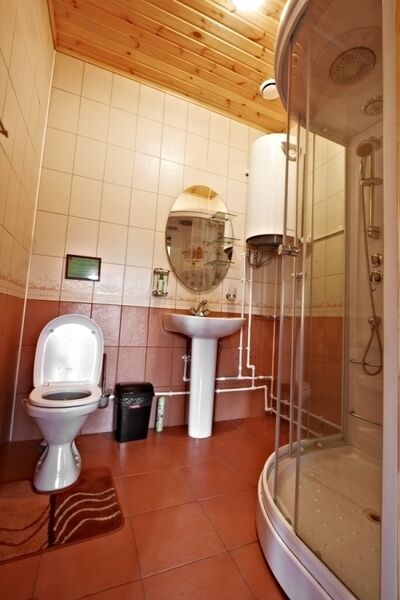 При входе в номер – вешалка, полка для багажа и обуви. (Некоторые номера оборудованы оружейными сейфами). Ванная комната (с теплыми полами) с душем, зеркалом и туалетными принадлежностями.