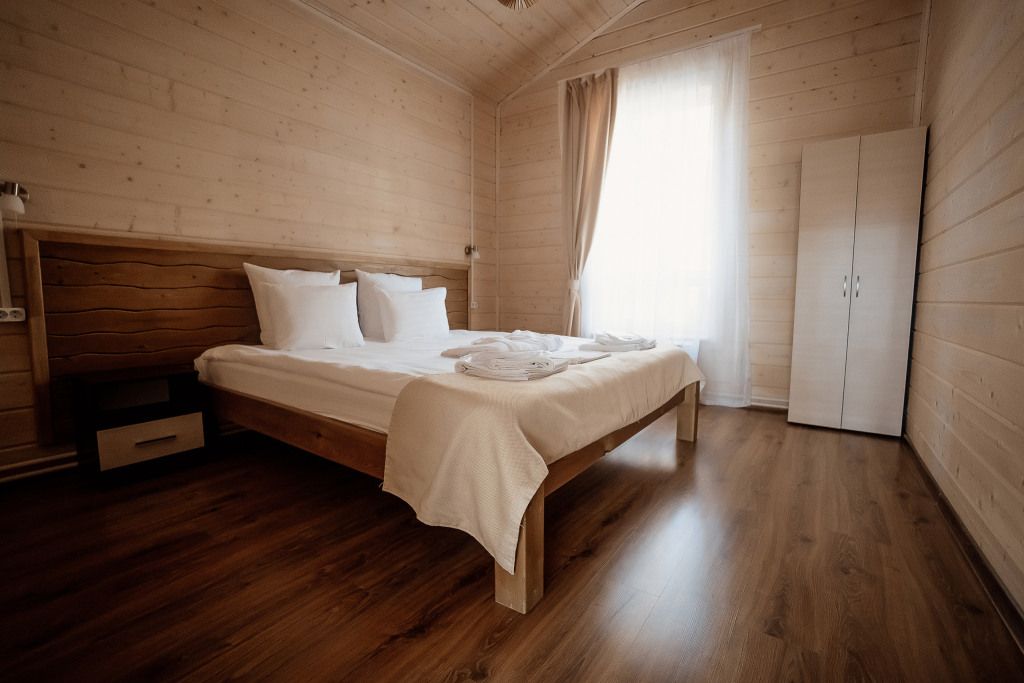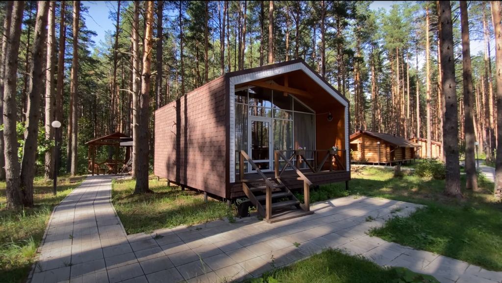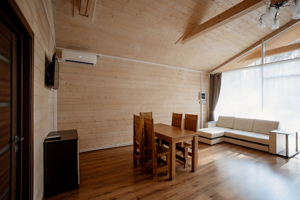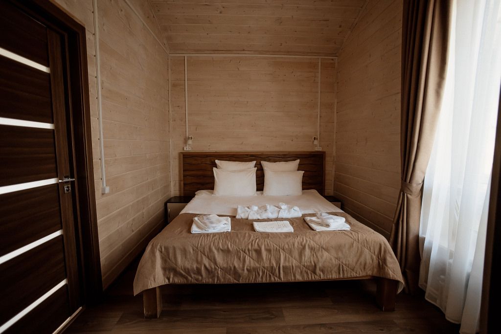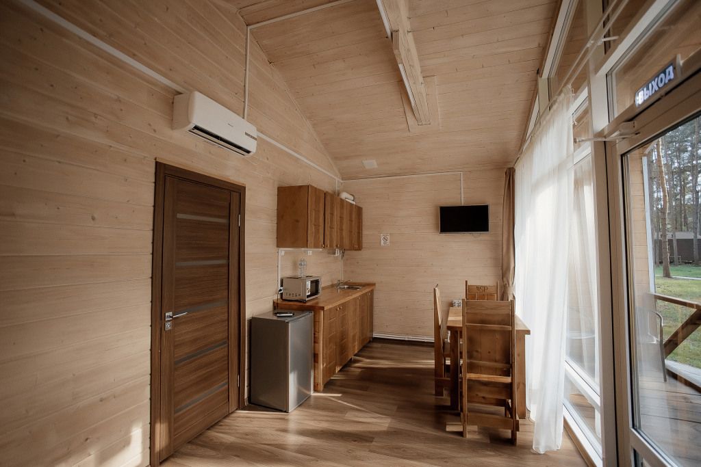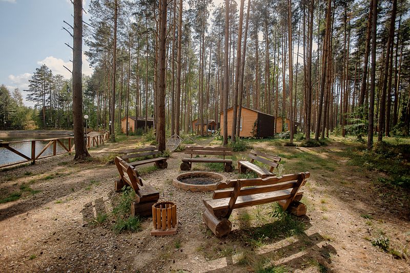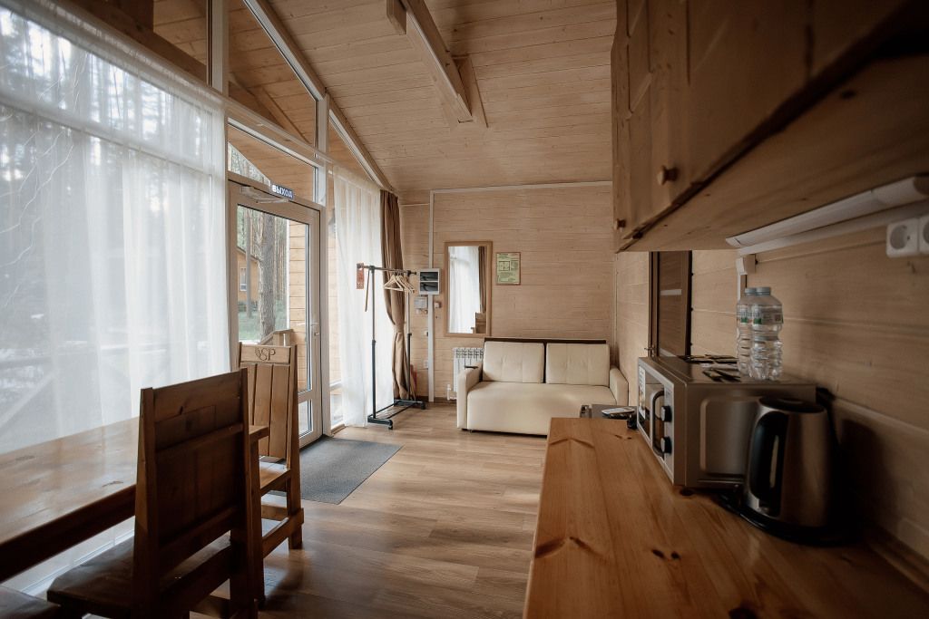 Всего на территории отеля 20 отдельно стоящих домиков (коттеджей). Каждый домик оборудован котлом, что позволяет регулировать комфортную температуру внутри. В просторной гостиной найдется место для всех — здесь можно посидеть в компании 8-10 человек. На ухоженной и красивой территории имеются 2 бани, озеро с рыбалкой, банкетный зал и детская площадка, автостоянка и место для костра.