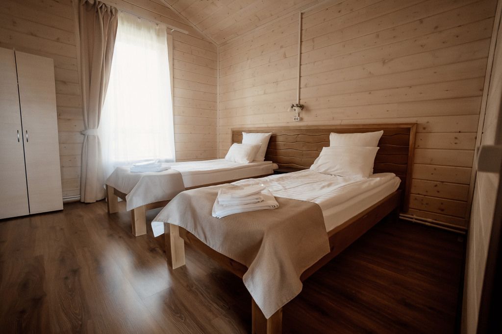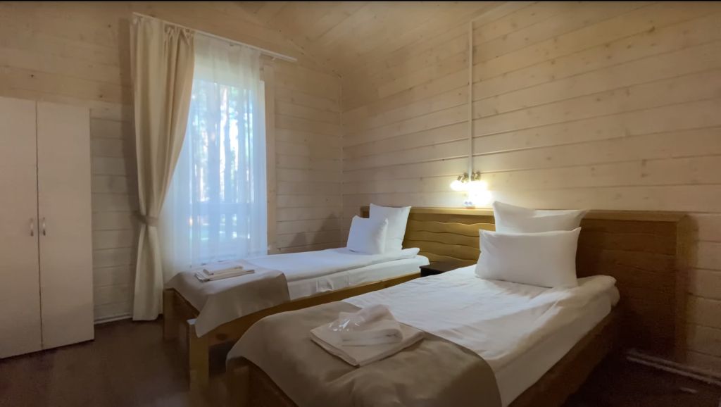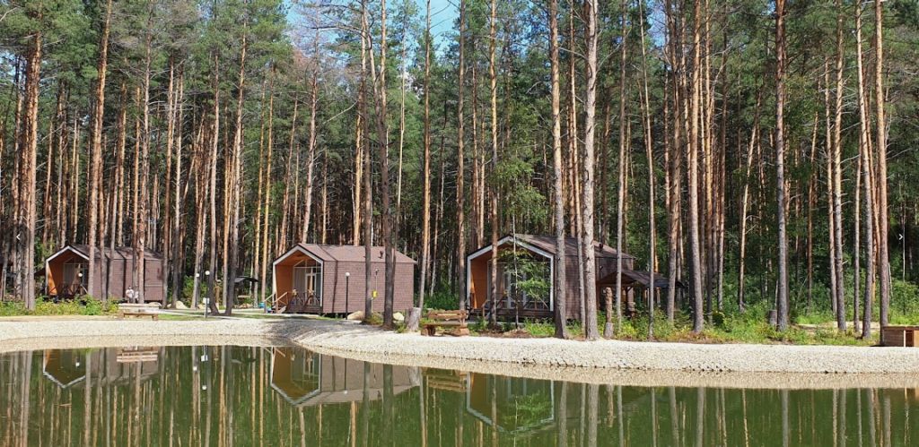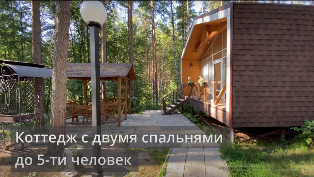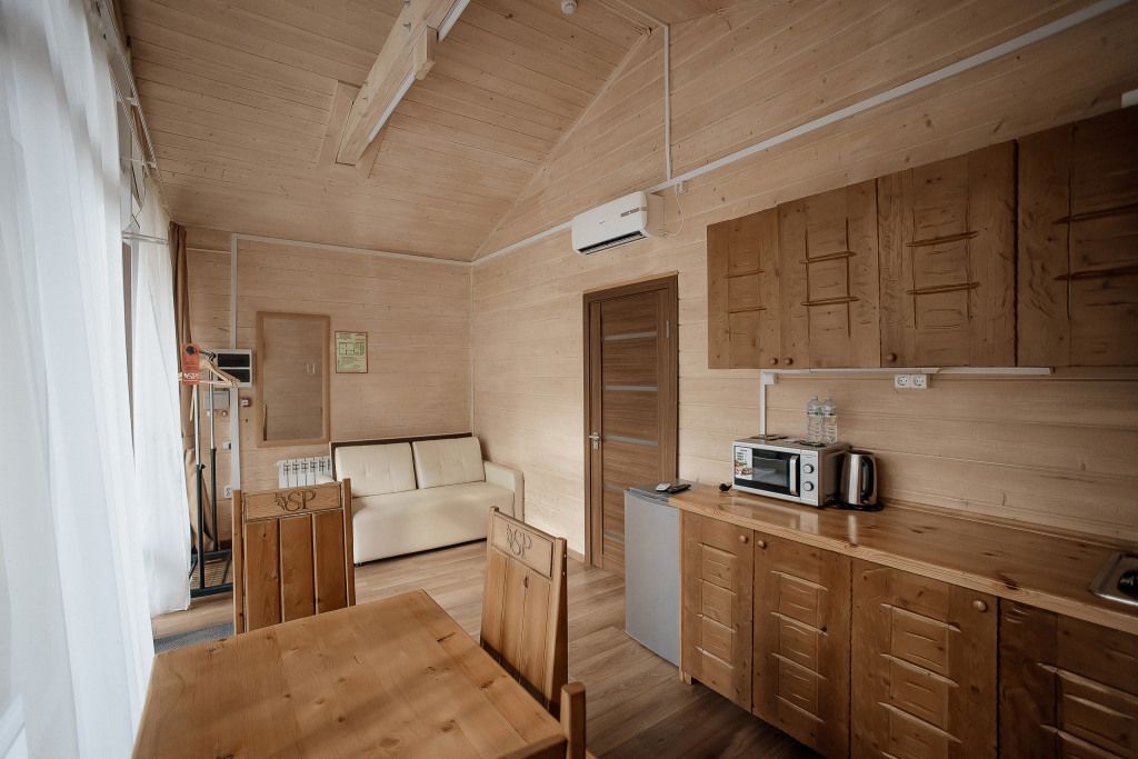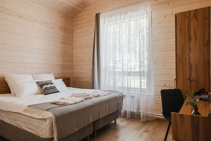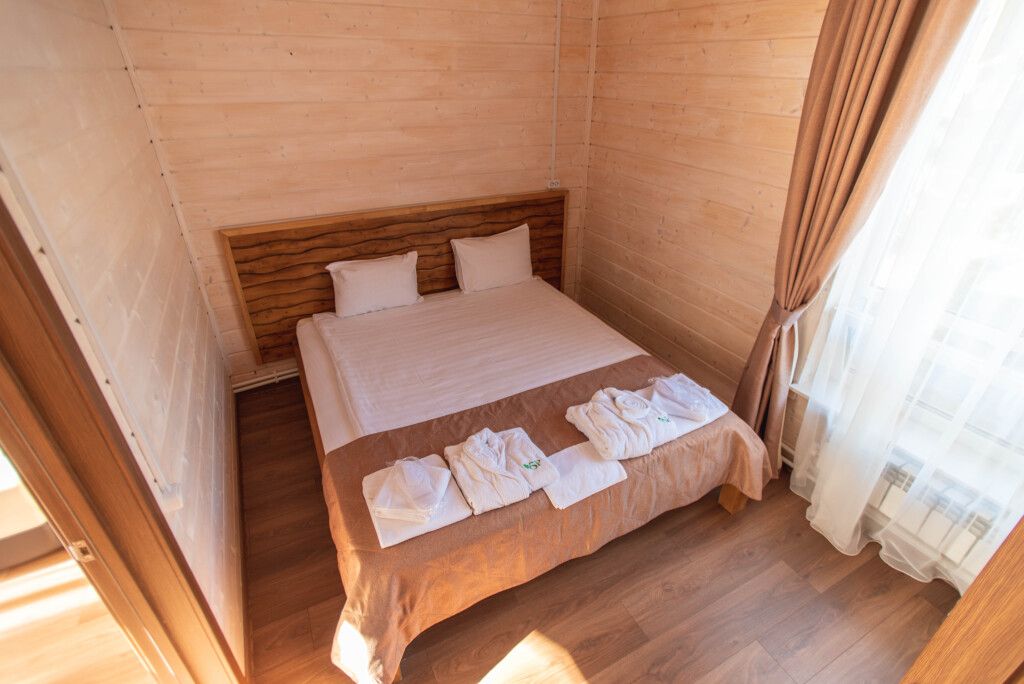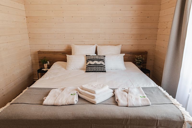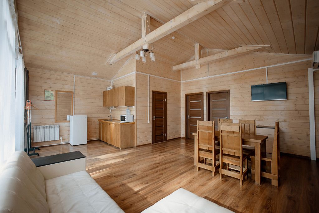 Всего на территории отеля 20 отдельно стоящих домиков (коттеджей). Каждый домик оборудован котлом, что позволяет регулировать комфортную температуру внутри. В просторной гостиной найдется место для всех — здесь можно посидеть в компании 8-10 человек. На ухоженной и красивой территории имеются 2 бани, озеро с рыбалкой, банкетный зал и детская площадка, автостоянка и место для костра.