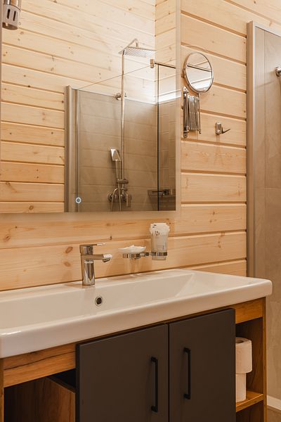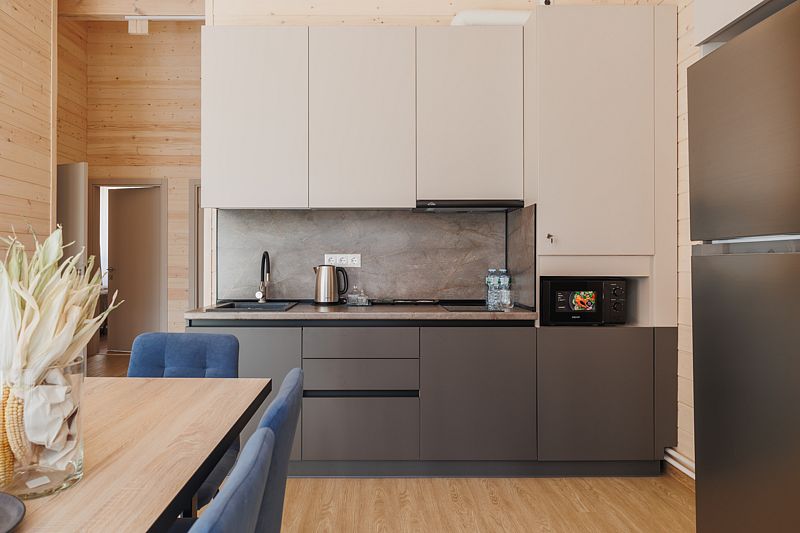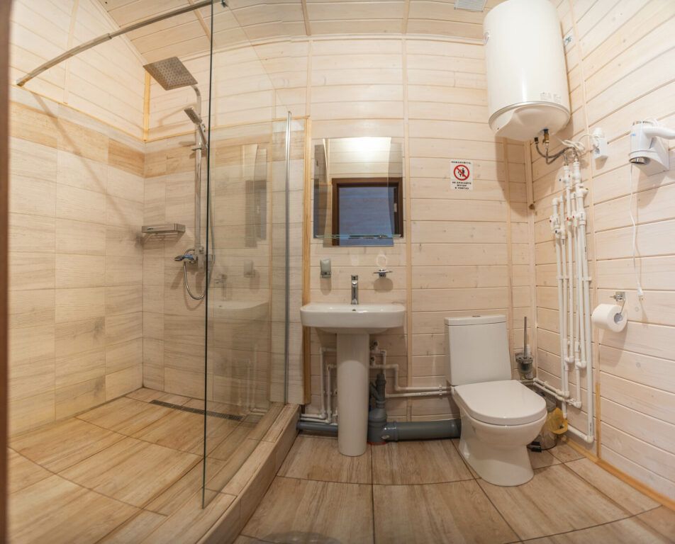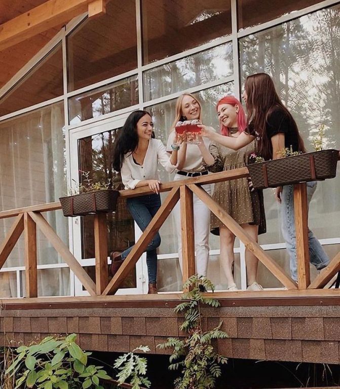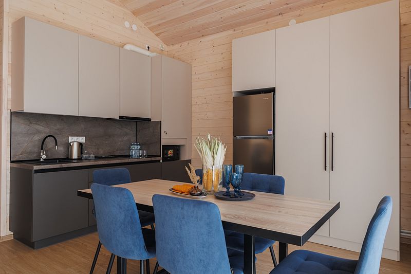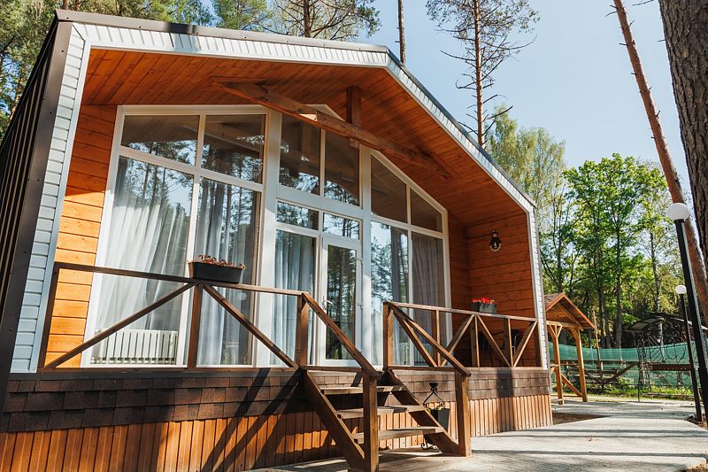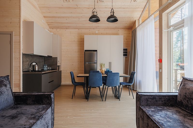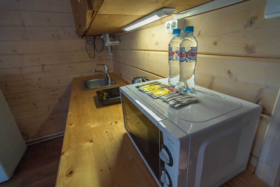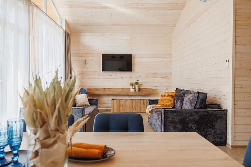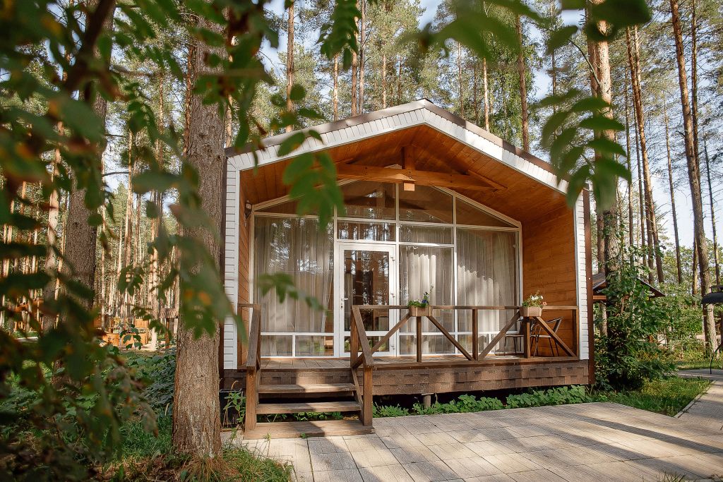 Всего на территории отеля 20 отдельно стоящих домиков (коттеджей). Каждый домик оборудован котлом, что позволяет регулировать комфортную температуру внутри. В просторной гостиной найдется место для всех — здесь можно посидеть в компании 8-10 человек. На ухоженной и красивой территории имеются 2 бани, озеро с рыбалкой, банкетный зал и детская площадка, автостоянка и место для костра.
