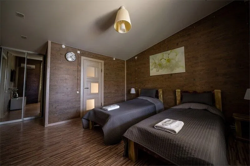 На втором этаже коттеджа находятся два номера. Один с двуспальной кроватью, другой с раскладным диваном. Телевидение, интернет и кондиционеры в обоих номерах.