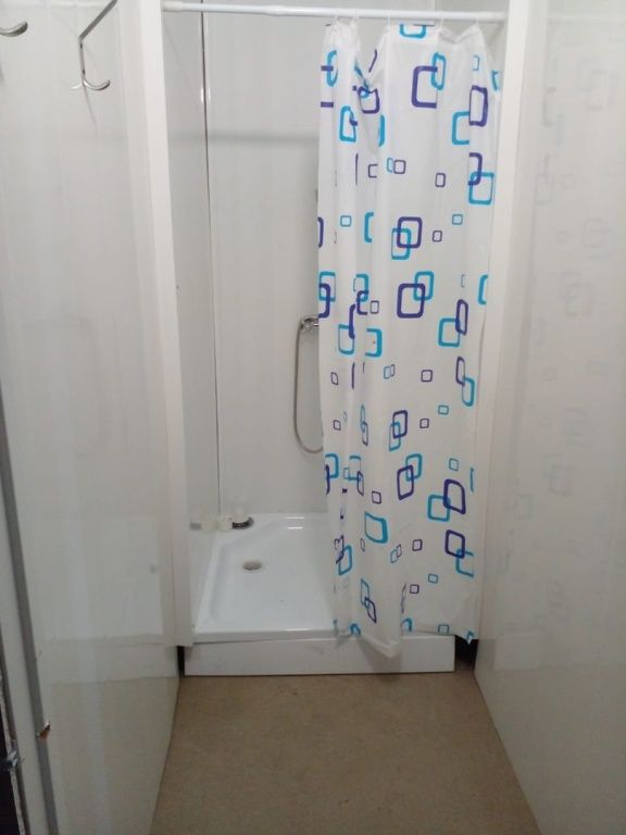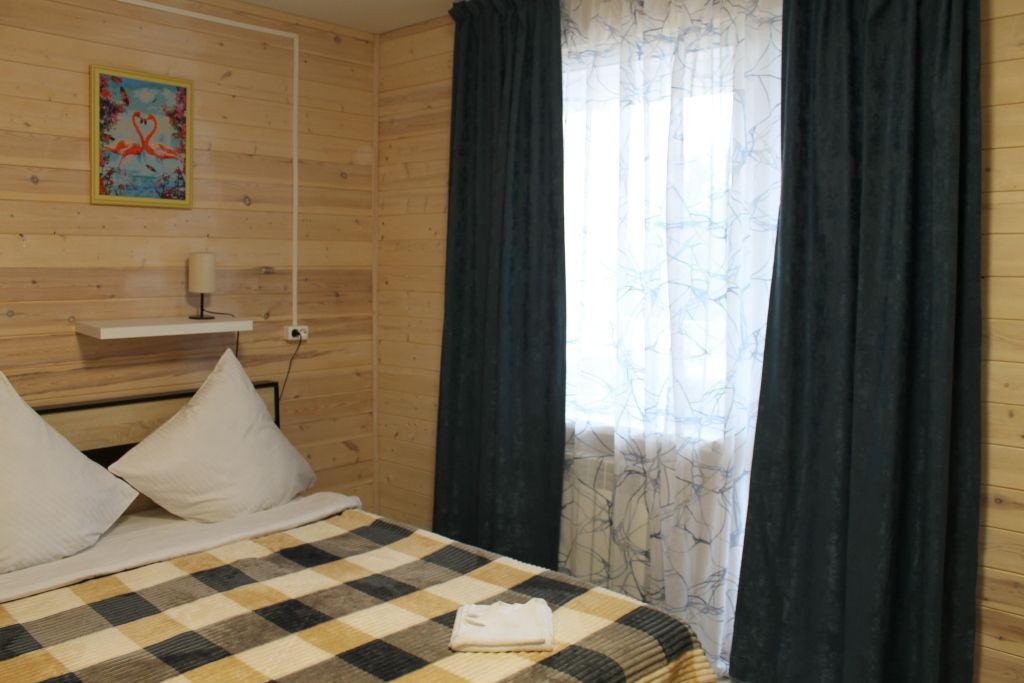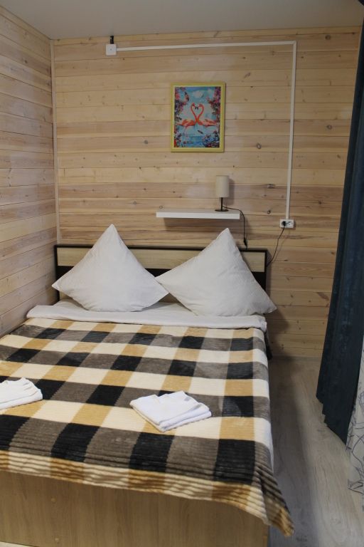 Холодильник, 1 двуспальная кровать, стол + 2 стула, электрический чайник, совместный санузел.