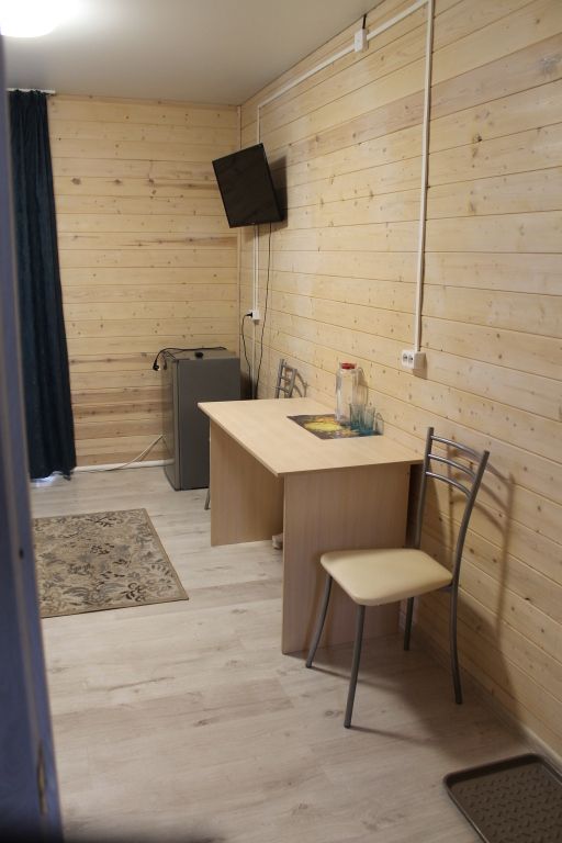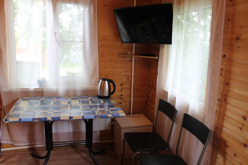 1этаж - стол + 2 стула, маленький холодильник, телевизор, электрический чайник, микроволновая печь, совместный санузел.