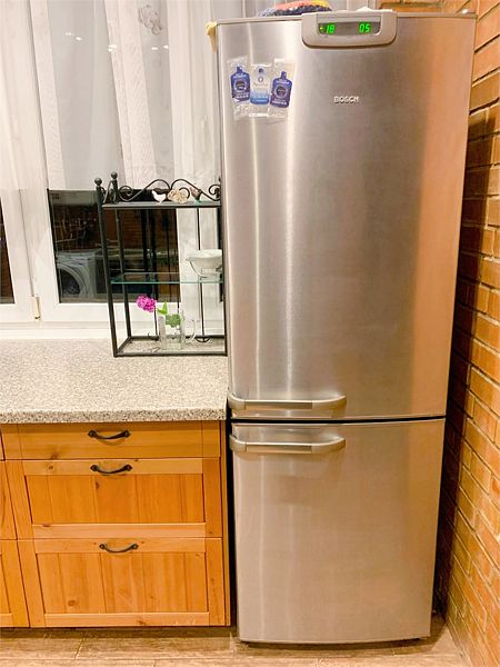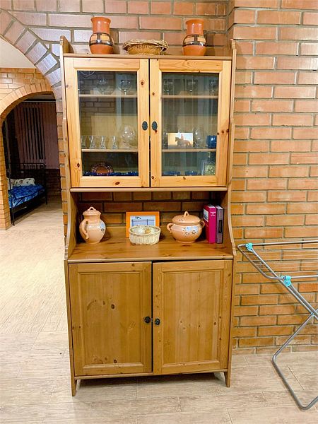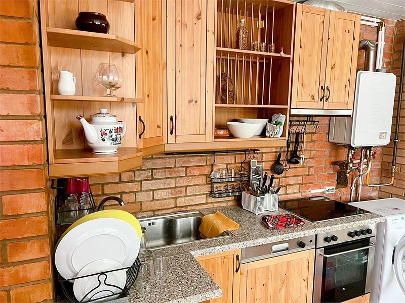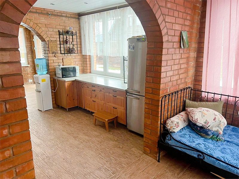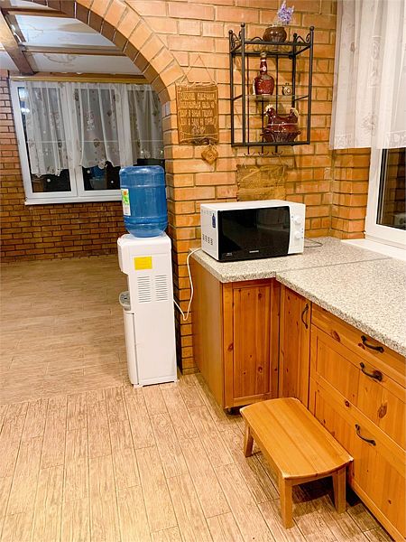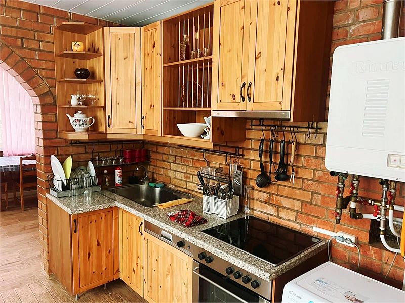 На первом этаже находится просторная обеденная зона и кухня с плитой, духовым шкафом, микроволновой печью, холодильником, кулером и стиральной машиной.