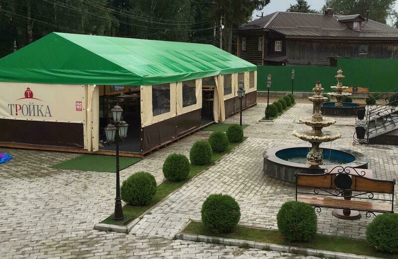 Летняя веранда является продолжением кафе. Здесь гости могут насладиться прекрасной кухней под шум фонтана на свежем воздухе.