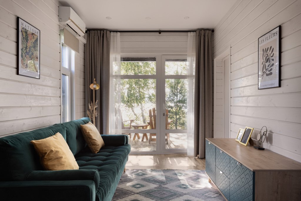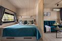 С собственной просторной террасы открывается вид на реку Сить, которая в этом месте превращается в море и достигает в ширину более 500 метров. Дизайнерское оформление в спальне выполнено в стиле Глэмпинг-шик, а в гостиной в спокойном скандинавском стиле.