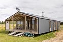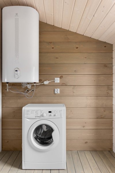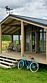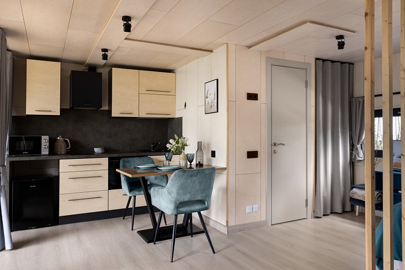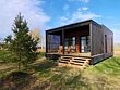 В мини-коттедже отделка выполнена из экологичного натурального дерева. Планировка: отдельный вход с тамбуром и шкафом для одежды и зеркалом, санузел с душевой, гостиная с кухней, спальня и крытая терраса.