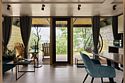 Современный лодж с отдельной спальней, просторной террасой и выходом на реку, расположенный на берегу реки.