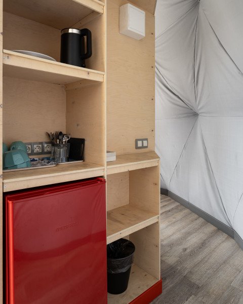 Гости глэмпинга располагаются в отдельной уединенной зоне с собственным BBQ-павильоном, костровой площадкой и панорамной смотровой вышкой.