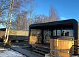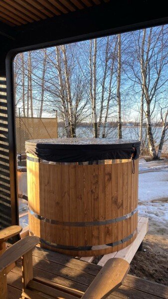 - банный комплекс на берегу реки: баня бочка с панорамным окном, подогреваемая купель фурако с аэромассажем и подсветкой, зона отдыха с мангалом, шезлонгами и обеденной зоной;