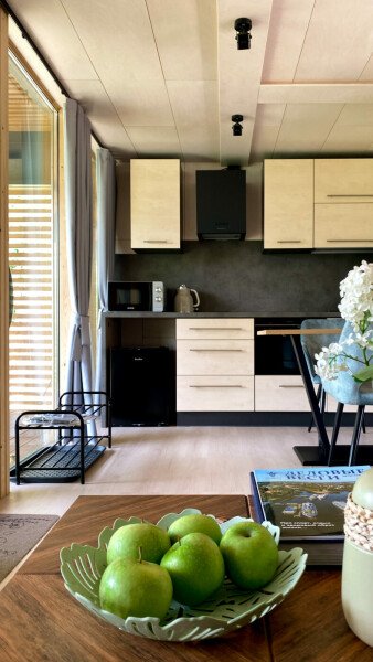 Внутри лоджа имеется собственный санузел (туалет, умывальник, душ), полноценная кухня (электрическая плита, посудомоечная машина, СВЧ, холодильник, чайник, посуда для сервировки и приготовления).