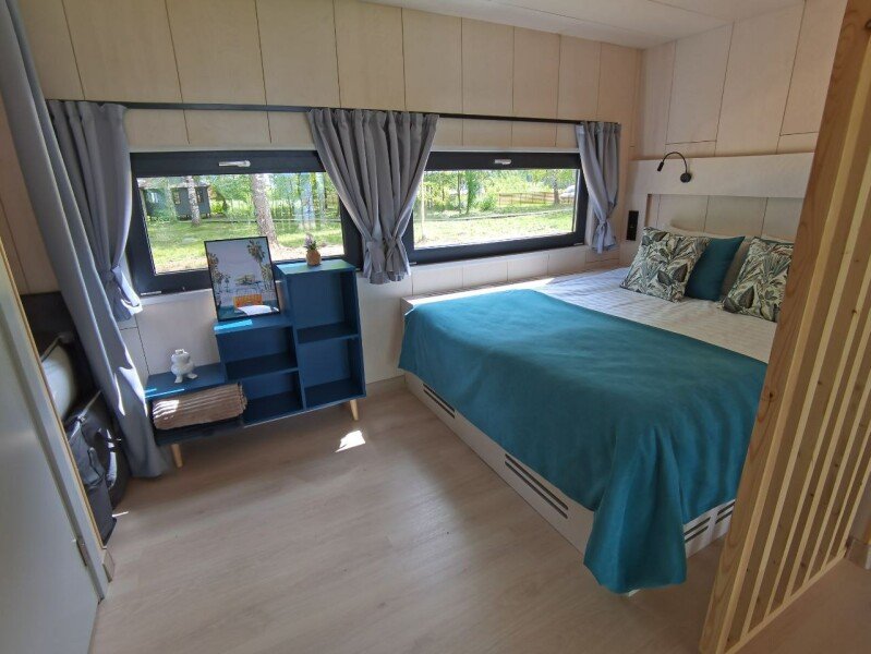 В этом небольшом, но очень уютном мини-коттедже отделка выполнена из экологичного натурального дерева. Внутреннее пространство разделено на спальню, гостиную и кухню.