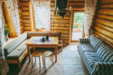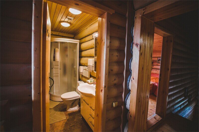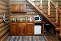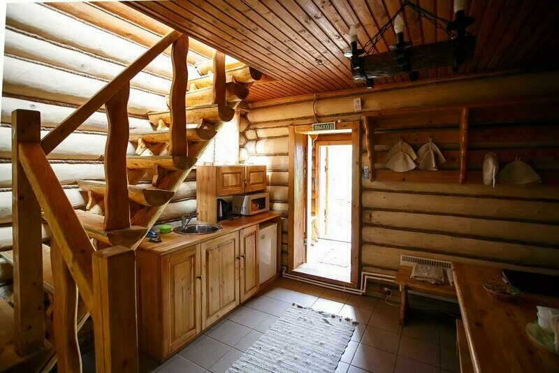 В номере коттеджа «Дом Охотника» на первом уровне (этаже) располагается: прихожая и небольшая гостиная с кухонной зоной. Также в номере есть санузел.