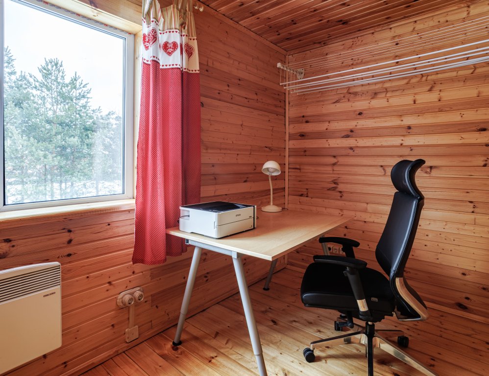 В холле второго этажа располагается удобное рабочее место. Крупногабаритный стол с деревянной столешницей и новое офисное кресло из натуральной кожи.