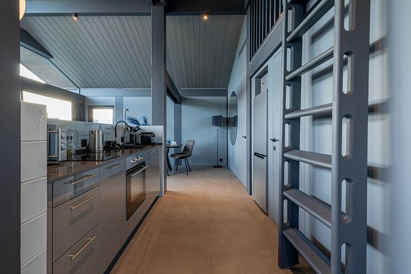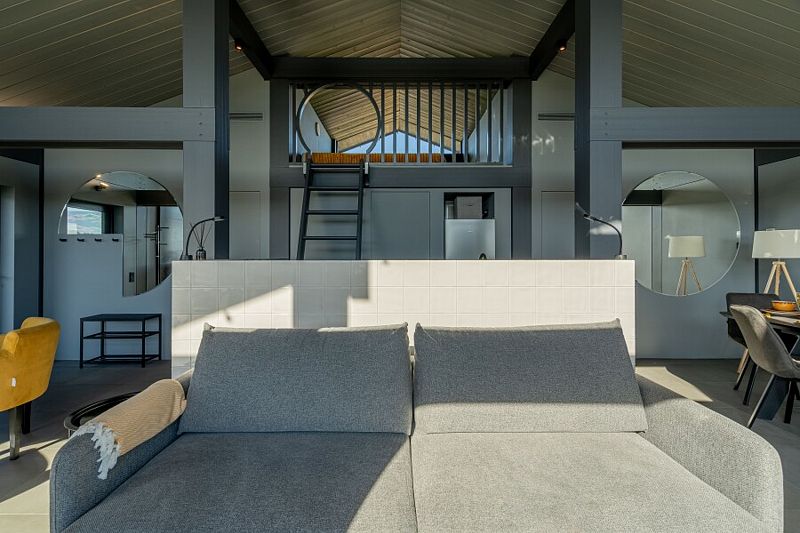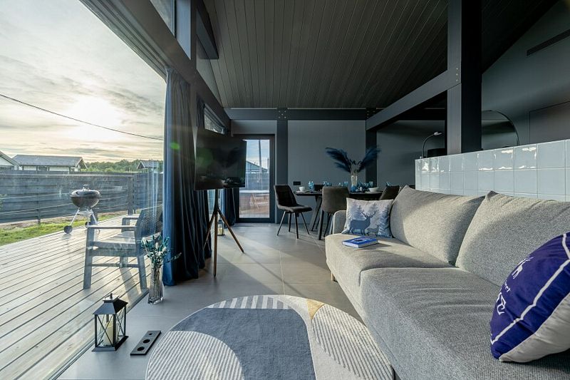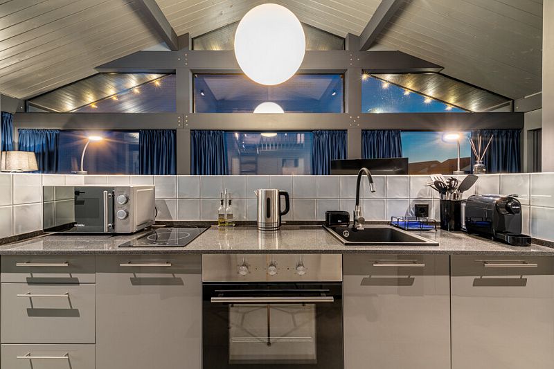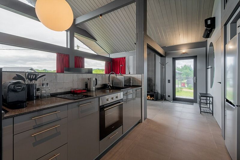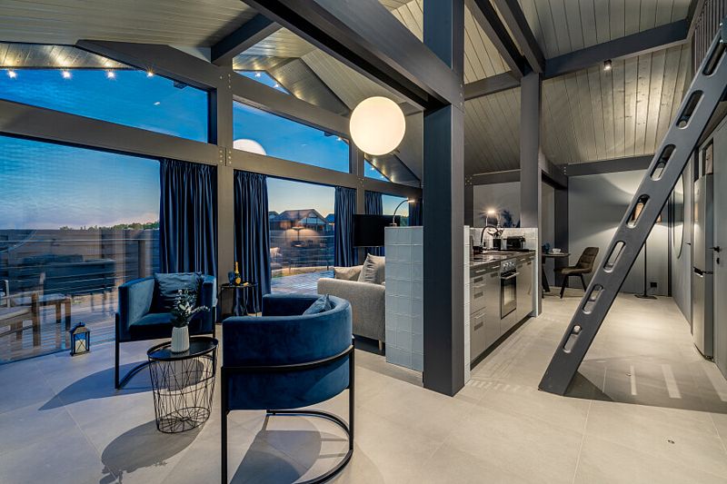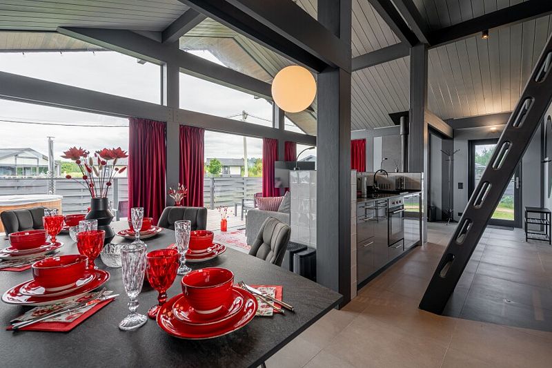 - просторная кухня-гостиная с большим раскладывающимся диваном, с панорамным остеклением и видом на озеро;