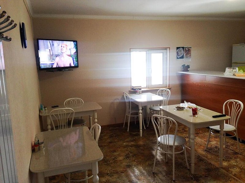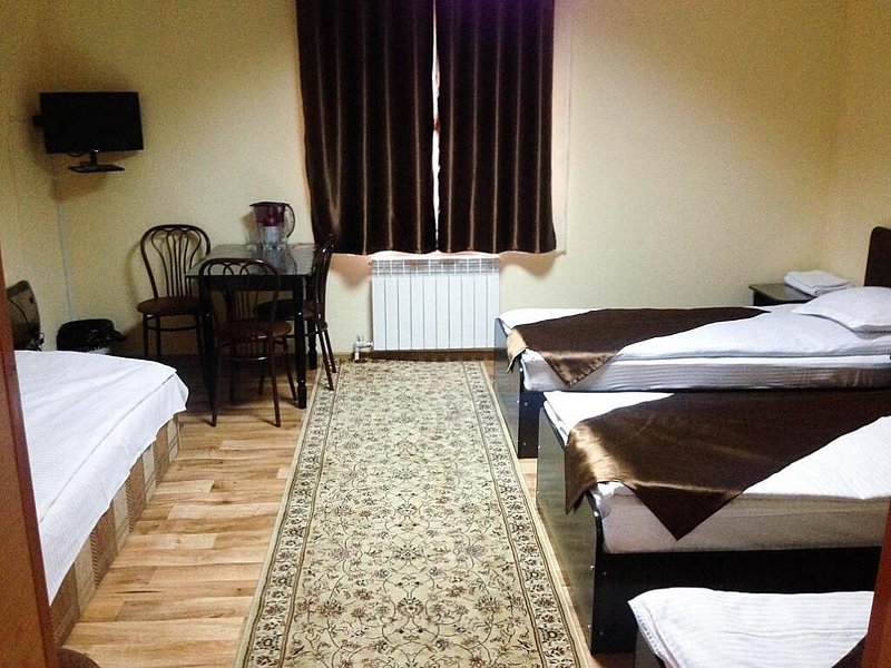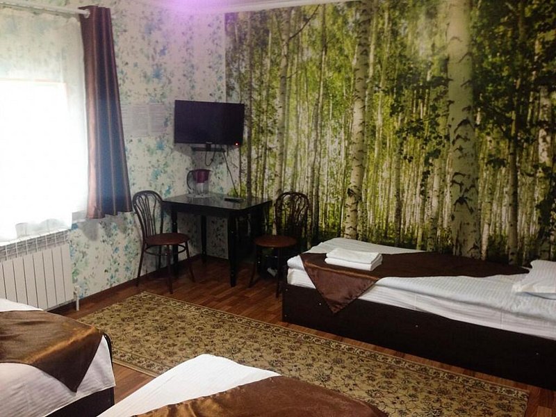 В номере: пять односпальных кроватей, фен, чайник, холодильник, телевизор. Собственная ванная комната.