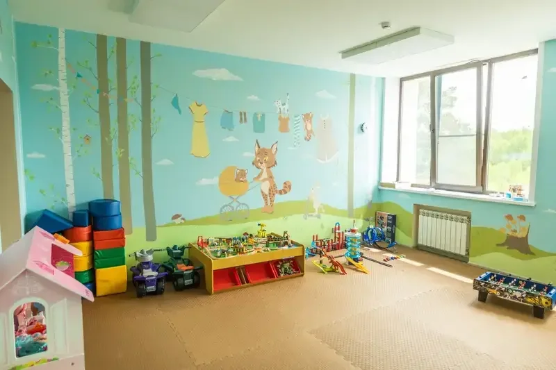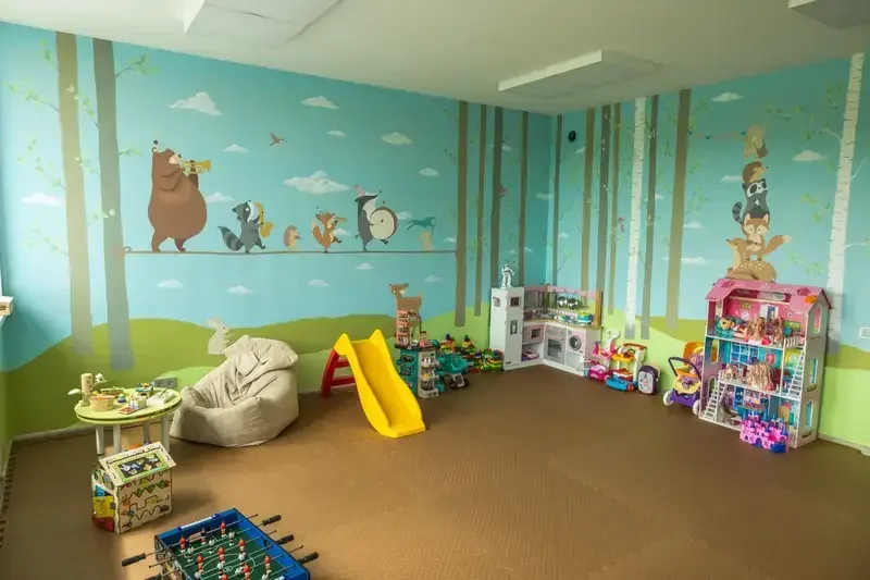 Игровая комната «Рысь» комната курорта – настоящее царство игрушек! Здесь и волшебный кукольный домик со всей мебелью, самая настоящая железная дорога, несколько скоростных треков и тд. Поиграть в доктора, парикмахера, повара, сантехника, строителя? Легко! А если ребенок любит пазлы, головоломки, развивающие игрушки, рисовать или читать – для него целый арсенал пособий.
