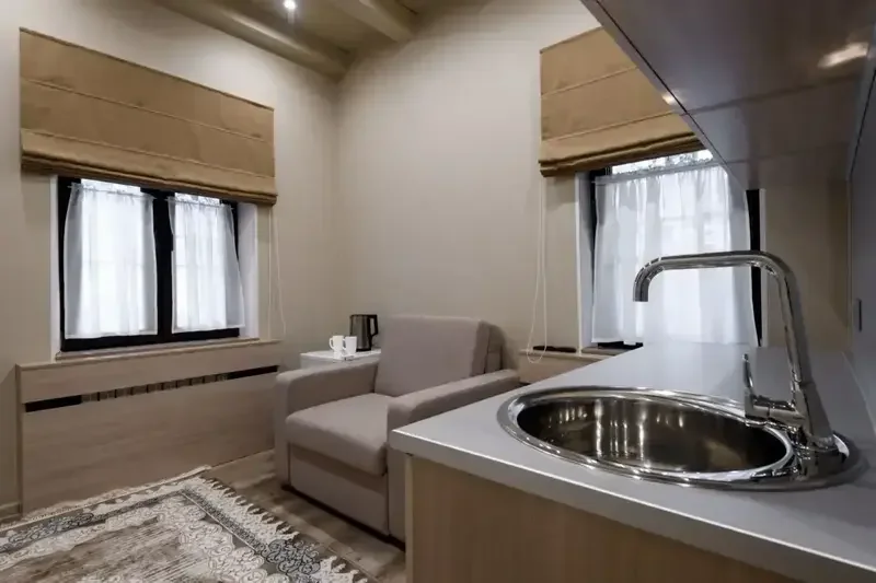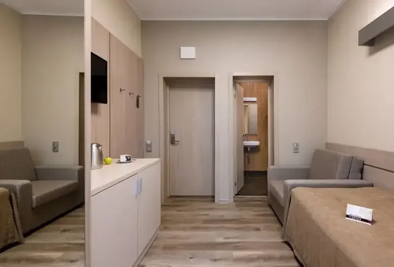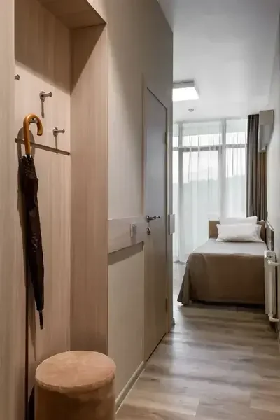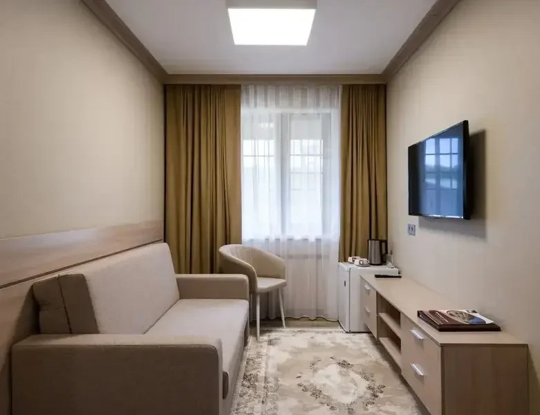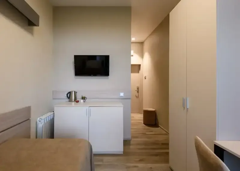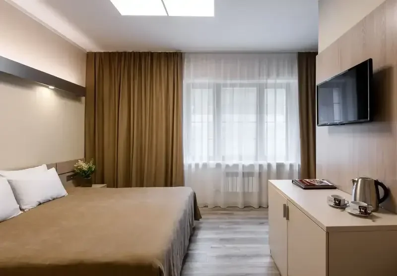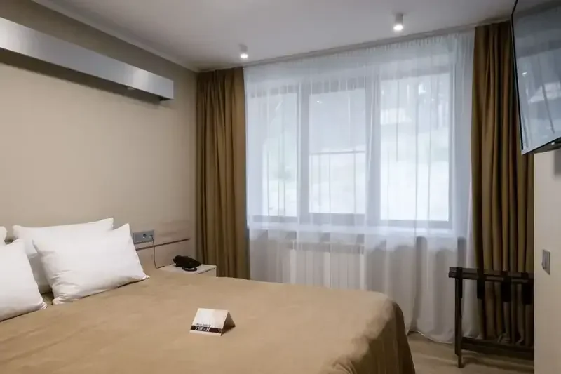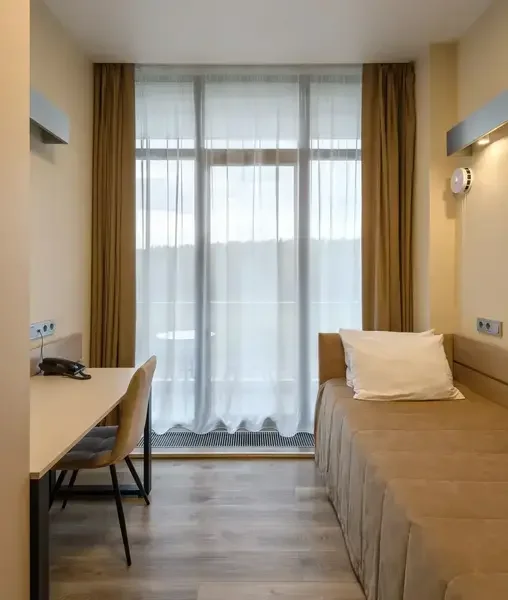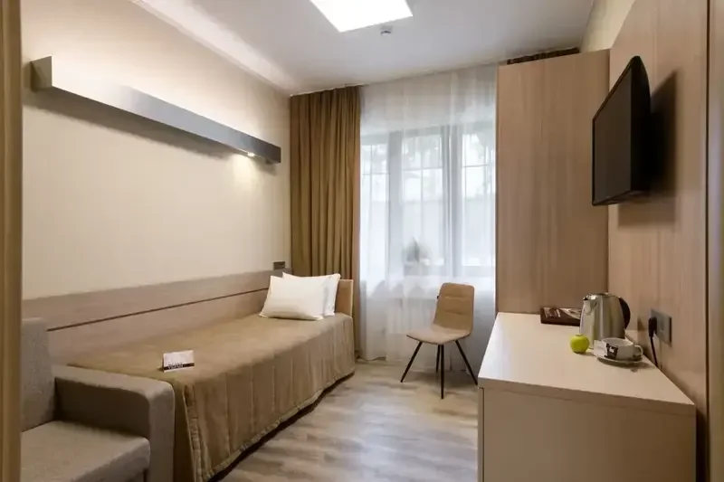 Уютный, современный одноместный номер, комфортно оборудованный для проживания. Интерьер выполнен в спокойных тонах для вашего комфорта. Из окна открывается прекрасный вид на сопку или пруд.
